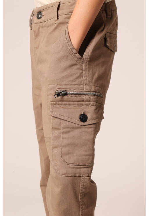 This casual style features a straight, slightly tapered fit, with flapped patch pockets on the back and sides, and a zipped pocket on each thigh for a utilitarian look.