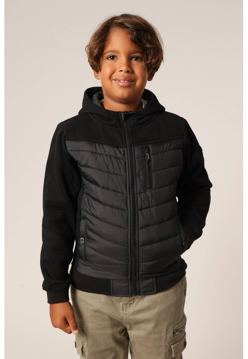 MARSHAWN casual jacket for boys. This zippered jacket is designed with a quilted front for a puffer jacket effect and knit sleeves, for a hybrid look between a light jacket and a sweatshirt. Featuring a hood and ribbed cuffs, it ensures comfort and protection. It has two zippered chest pockets, two side pockets with snaps, and a round badge on the sleeve. A practical essential for mid-season.
