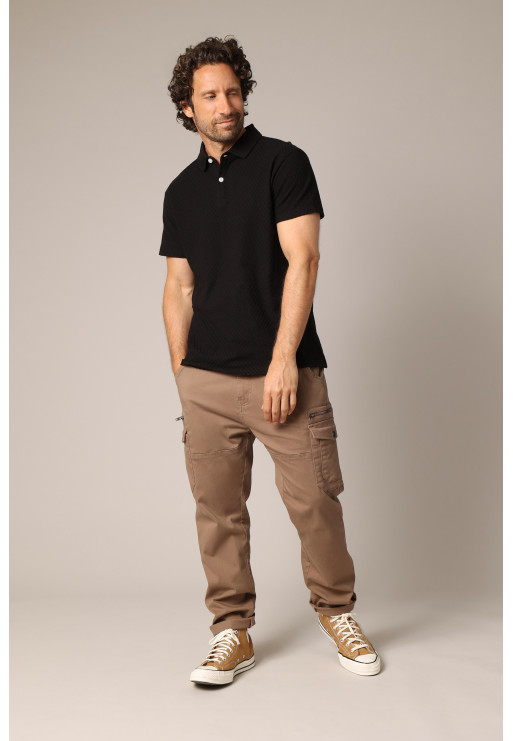 Behind its apparent simplicity, this black polo shirt reveals a subtle play of texture that captures the light and asserts an understated elegance. Its intricate fabric adds depth without ostentation, while the fitted cut and button-down collar reinforce its refined look. This model adapts to all occasions: it slips equally well under a blazer or over cargo pants, for a style that is as neat as it is casual. An essential piece for those who want to combine simplicity and distinction on a daily basis.