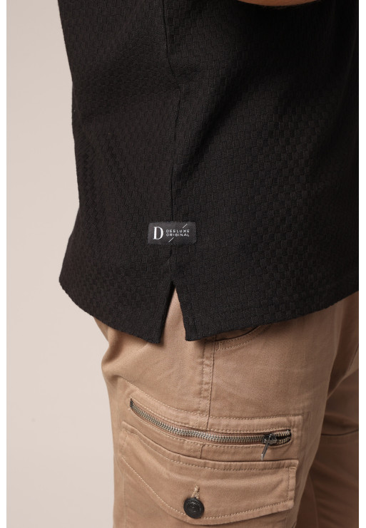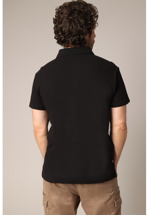 Men's black polo shirt in textured knit, classic collar and elegant cut.