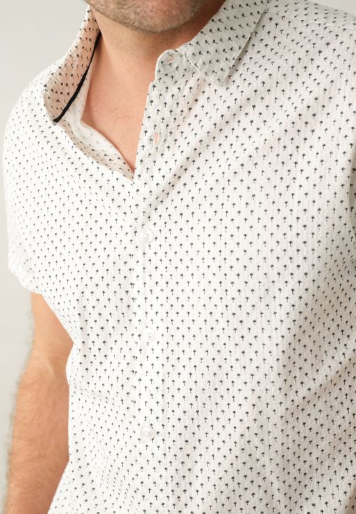 Cut in a seersucker fabric, it evokes a vibrant lifestyle. Embellished with buttons on the front and decorated with tropical motifs, including palm trees, this short-sleeved shirt with shirt collar embodies the authenticity of summer. Its classic cut and standard length add a timeless touch to your outfit.