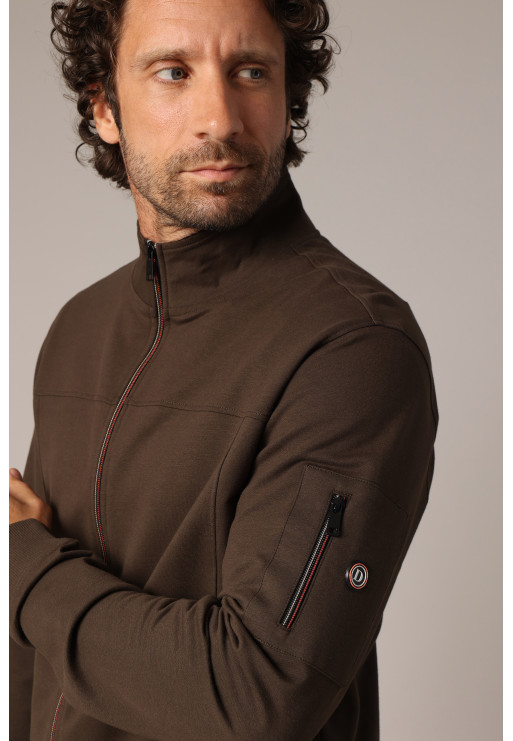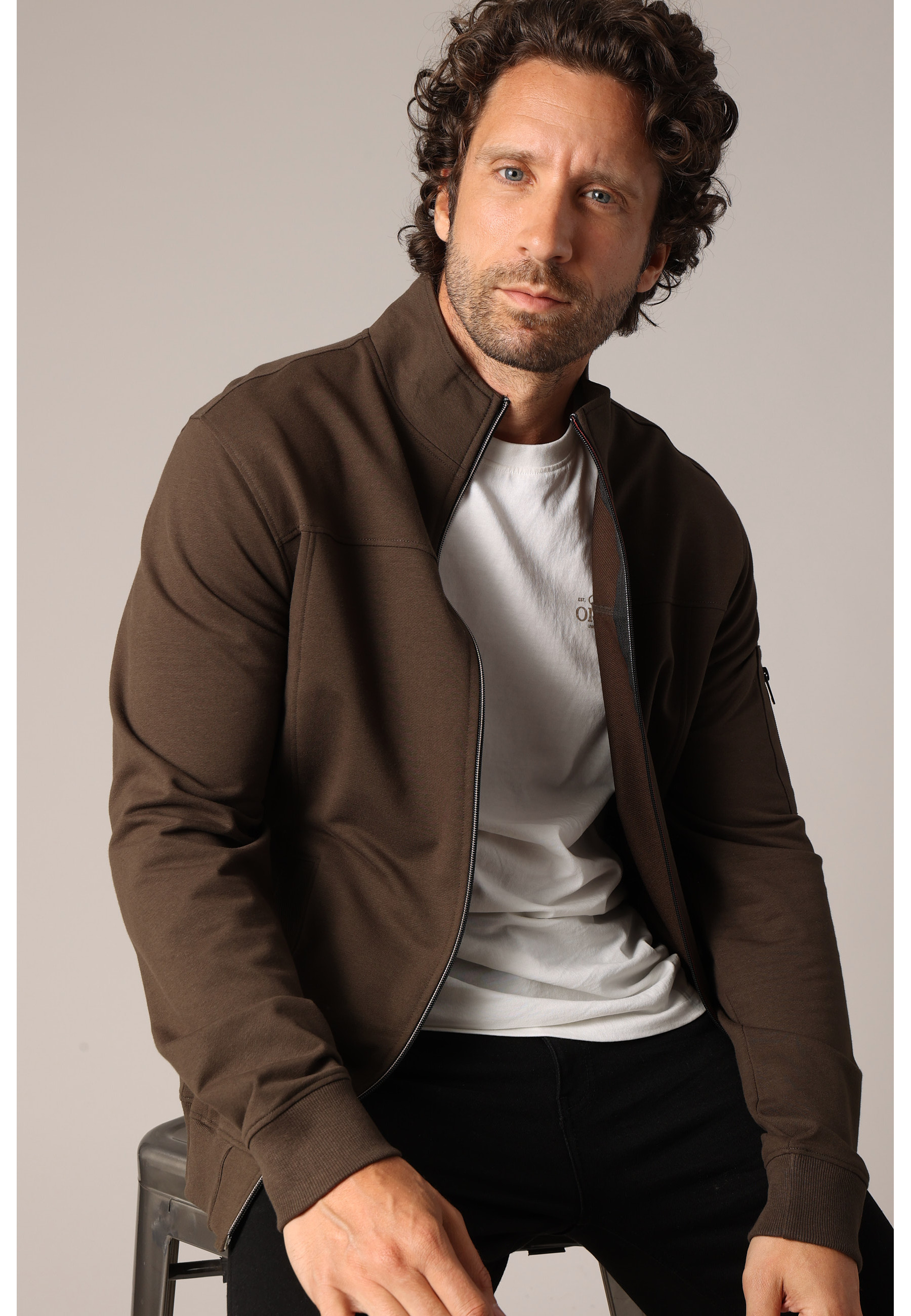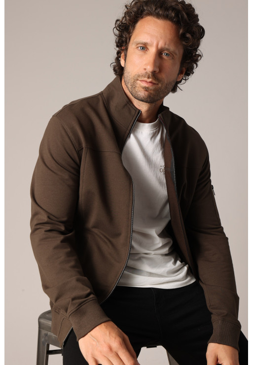 Its high collar sets the tone: a touch sporty, resolutely structured. A contrasting zip fastening, practical side pockets, and a zipped pocket on the sleeve subtly add rhythm to the look.