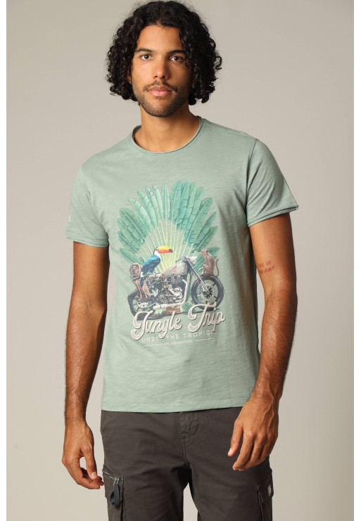 Our AVENTURA t-shirt takes you... on an adventure! It is a classic cut t-shirt, with an original print that mixes jungle and motorcycle themes. This Californian-style garment is available in several colors for a touch of freshness in your wardrobe: navy blue, light green, beige, black, white.