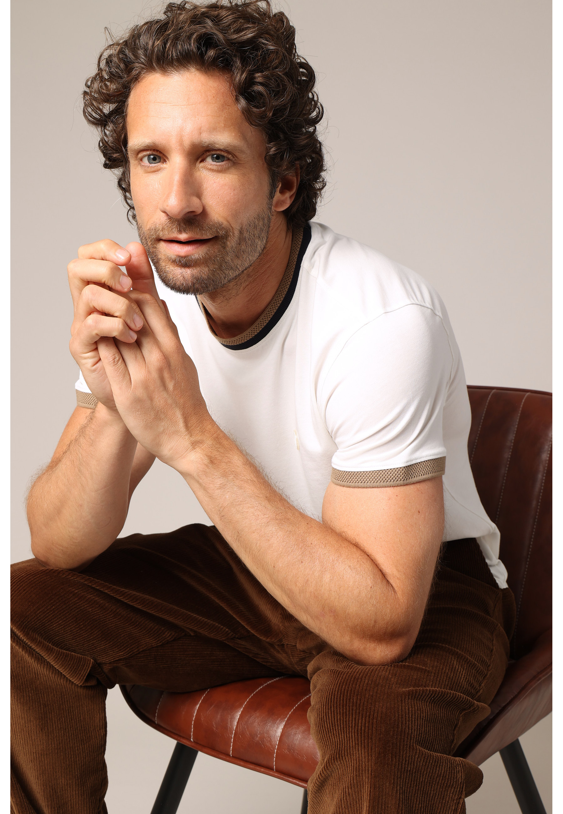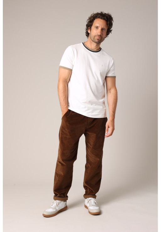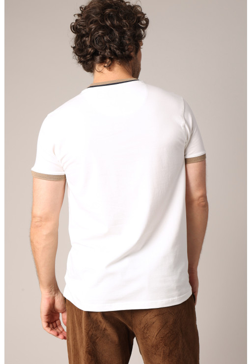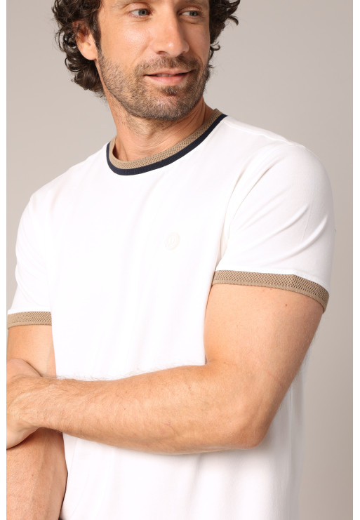 This men's T-shirt combines simplicity and refinement with its subtle details. It stands out with its contrasting ribbed edges on the round neck and sleeves, highlighted with a fine textured beige mesh-style border, which adds depth without being over the top. The small round badge sewn on the heart side adds a discreet signature. This model is available in several timeless colors to suit all styles, with a flattering and comfortable straight cut.