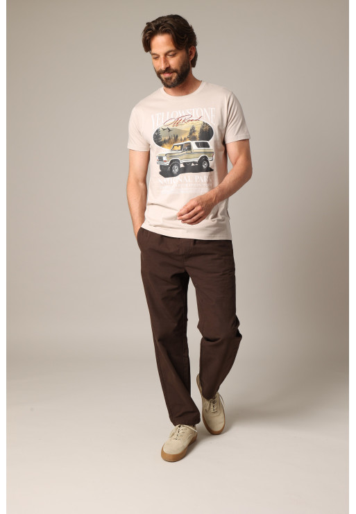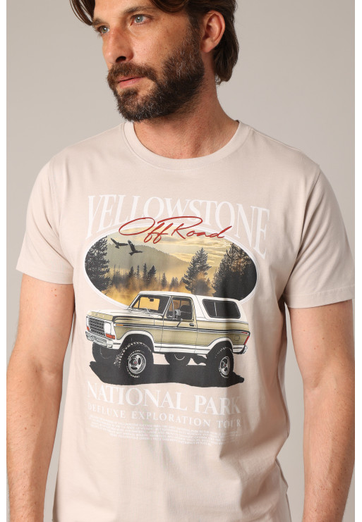 This t-shirt pays homage to the vast American landscapes with its large "Yellowstone Off Road" print on the front, featuring an iconic 4x4 against a forest and sunset backdrop. Its straight cut, crew neck, and soft 100% cotton material make it a comfortable piece to wear every day. It comes in several colors to vary the moods, between retro spirit and a taste for adventure. An ideal piece for nature and escape lovers, to wear with jeans or Bermuda shorts for a casual but assertive style.