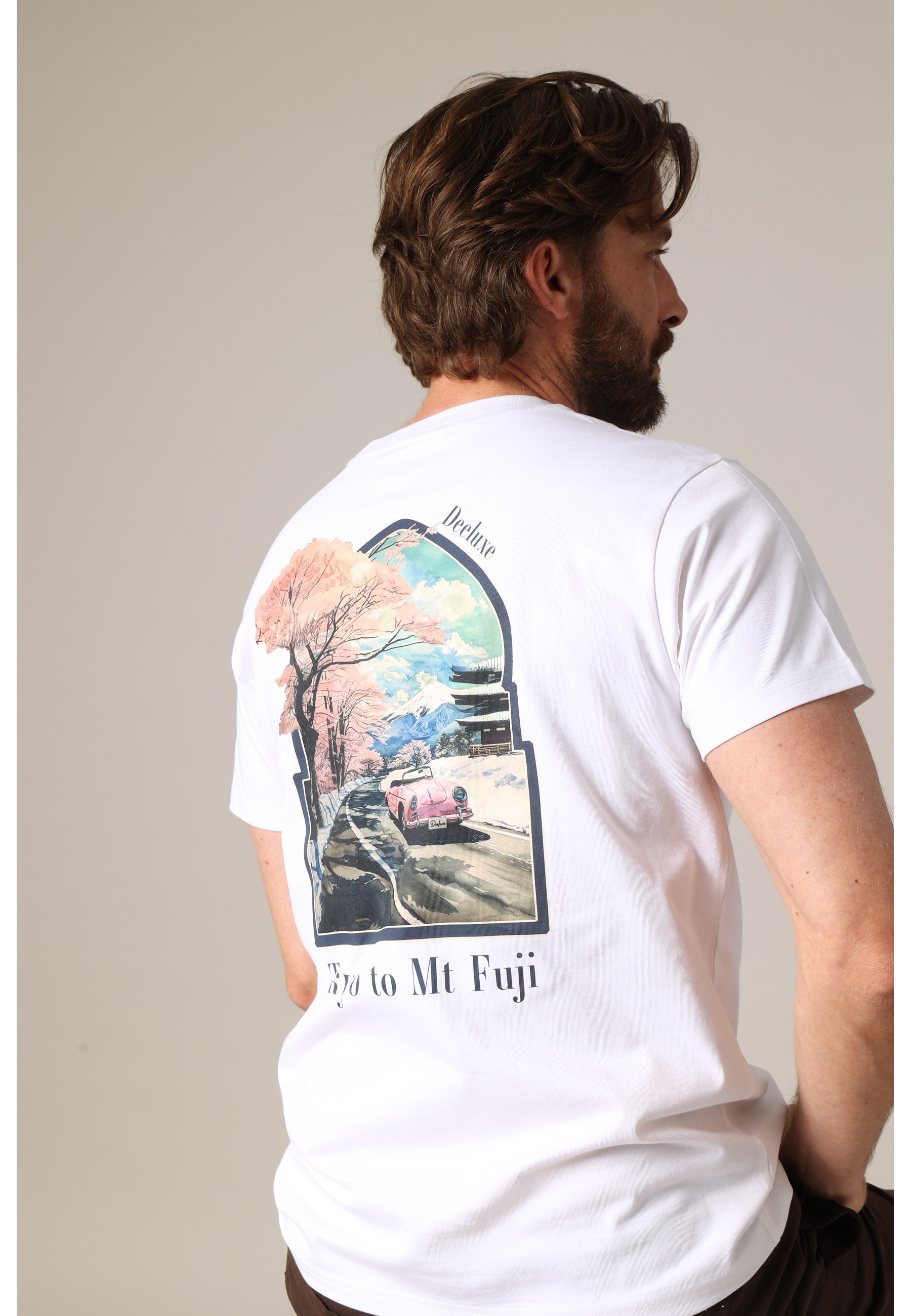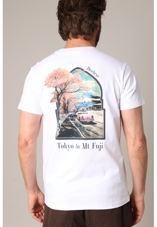 Travel in style with this 100% cotton men's t-shirt, designed for free spirits and those who love to escape. Its straight cut and crew neck ensure absolute comfort, while the front features a simple "Tokyo Deeluxe" branding in clean typography. On the back, the postcard-style illustration makes all the difference: a springtime setting and a road to Mount Fuji, enhanced by a pink vintage car that catches everyone's eye. A graphic piece that adds a touch of poetry and originality to your urban looks. Available in several colors.