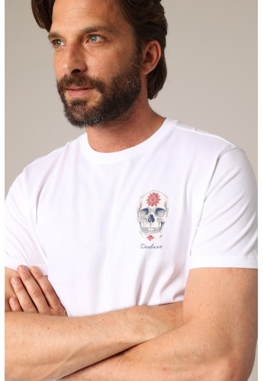 Show off your style with the MANDOU men's t-shirt. This straight-cut style features a graphic look with a richly detailed skull and mandala print on the back. The motif is repeated in miniature on the left side, along with the Deelux signature.