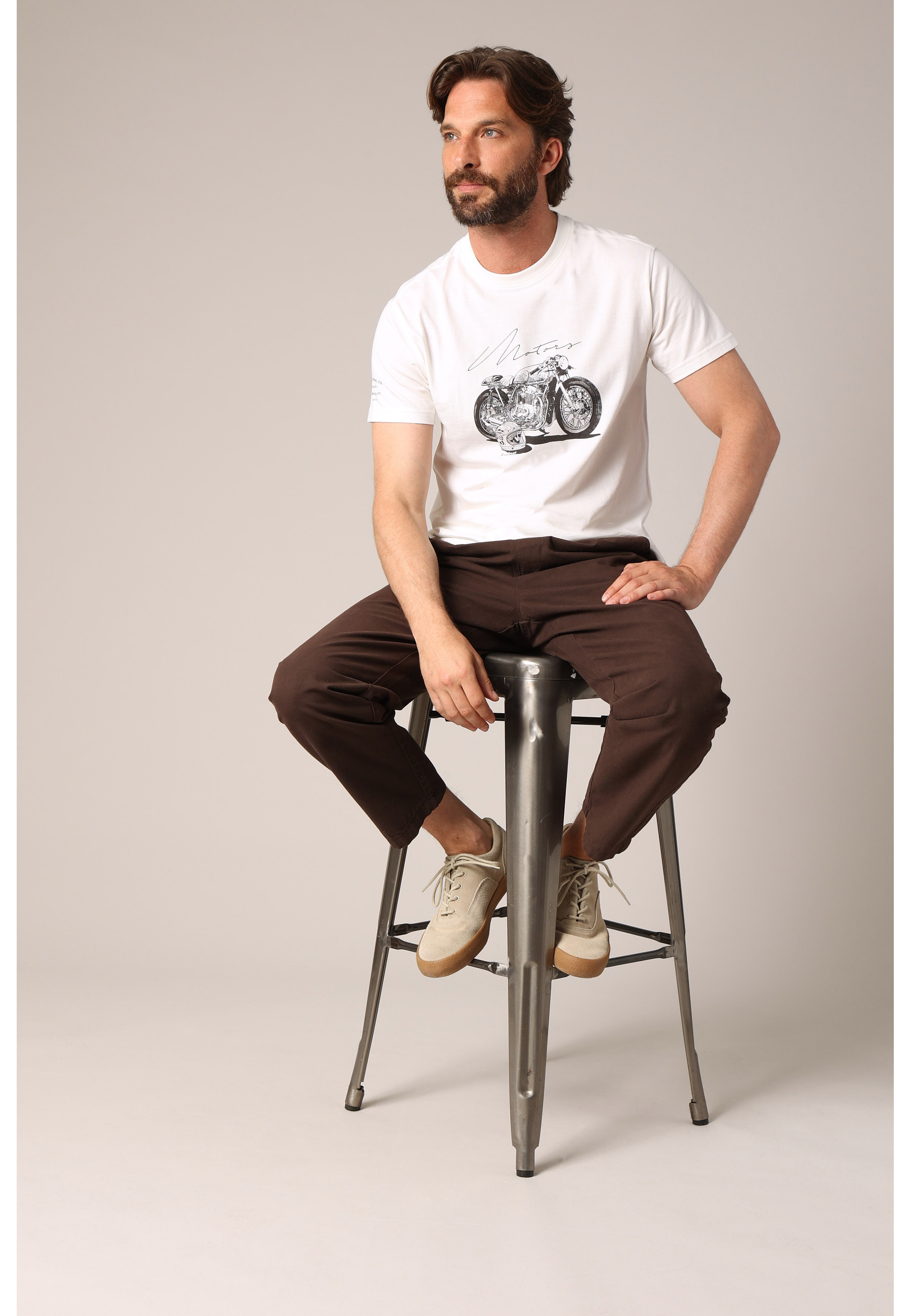 This men's t-shirt revisits casual wardrobe classics with a vintage touch. Its central motif depicts an old-school motorcycle accompanied by a helmet and the word "Motors" in calligraphy, evoking the world of bikers and the great outdoors. The crew neck and straight cut offer comfortable everyday wear. Available in several colors, this model is ideal for asserting an urban or adventurer style while maintaining a polished look.