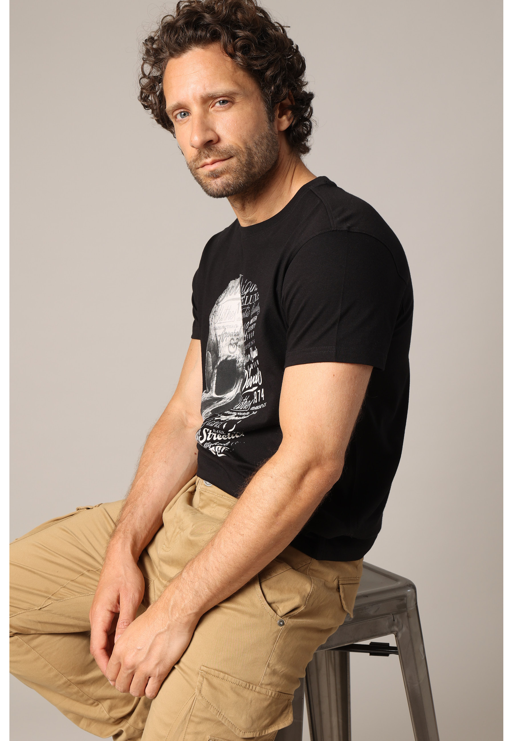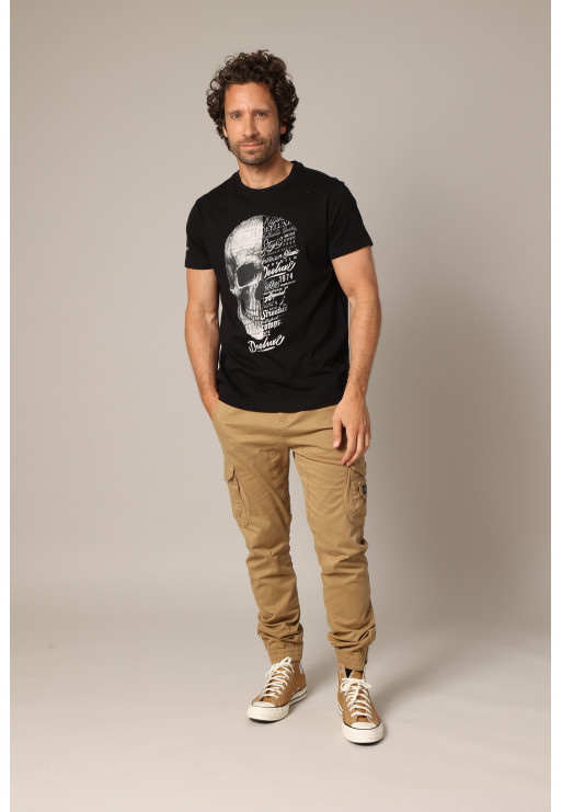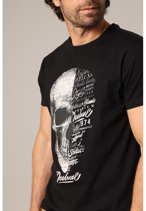 This men's VEGAS t-shirt combines streetwear with a striking artistic touch. On the front, a large half-skull, half-typography illustration immediately captures attention, playing on the contrasts between graphic shapes and intertwined words. The black and white visual, highlighted by the "Deeluxe" signature, gives this piece a strong identity. Crafted from soft cotton, it offers optimal comfort all day long. Its classic cut with a crew neck and short sleeves adapts to all styles, from raw denim to cargo pants. Available in several color variations, this model revisits the codes of the printed t-shirt with a bold urban twist.