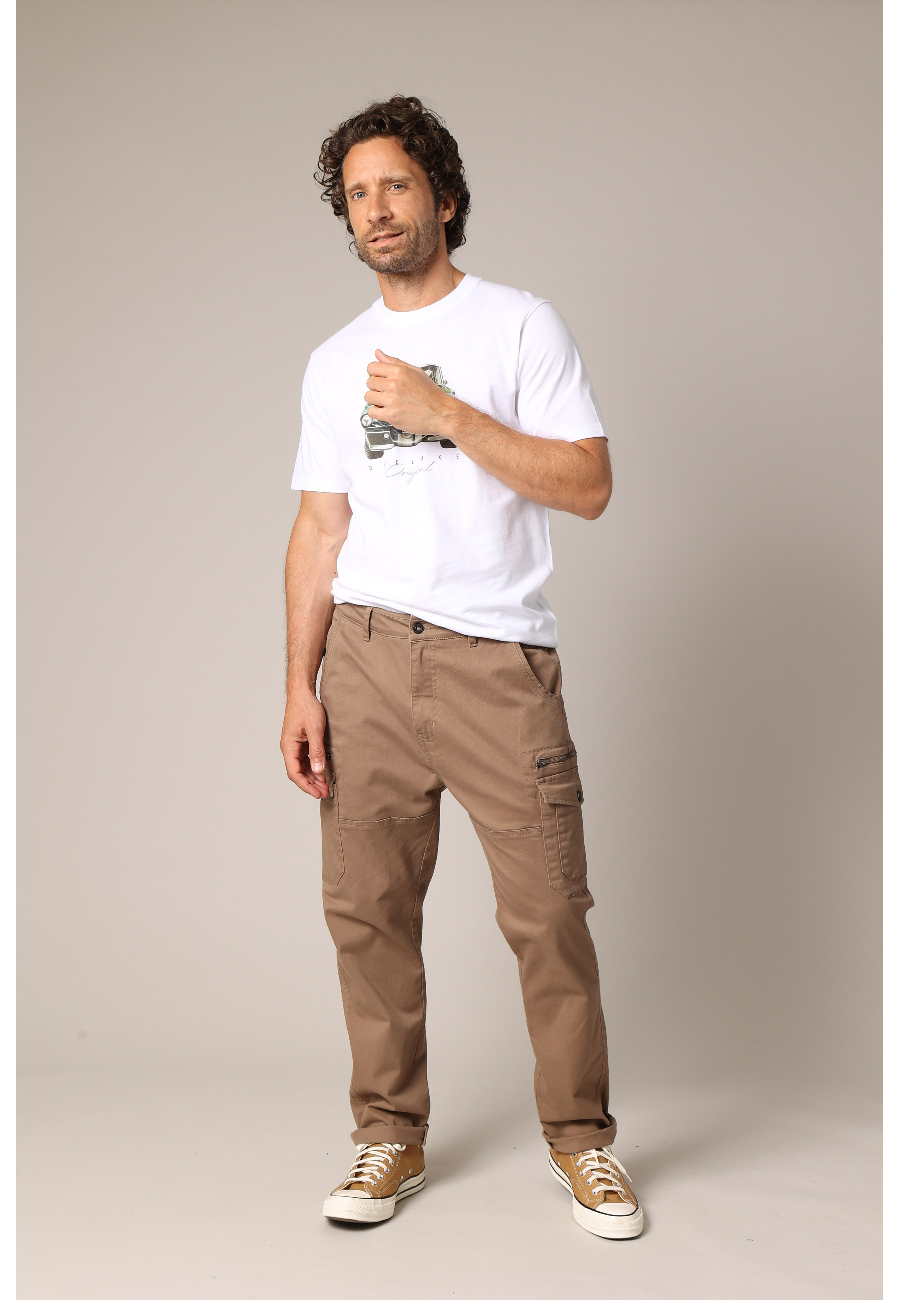 DANASON men's cargo pants. These casual pants feature a straight, slightly tapered fit with flapped patch pockets on the back and sides, and a zippered pocket on each thigh for a utilitarian look.