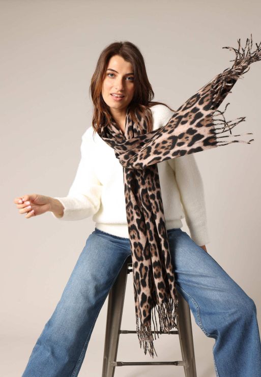 Make your style roar with this soft leopard print scarf. It adds a touch of character to your outfits while wrapping you in irresistible comfort. The bold and trendy leopard print is paired with twisted fringes for a wild and chic look.