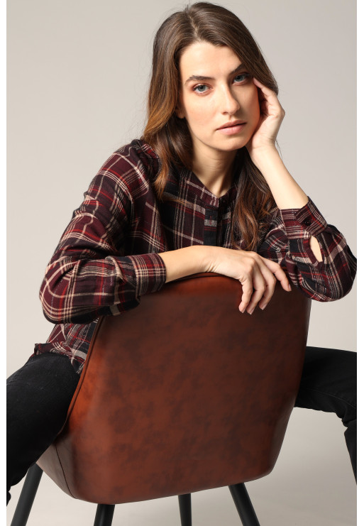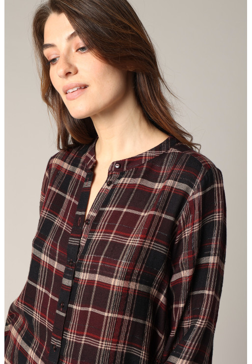 This plaid shirt revisits a classic with a modern and comfortable touch. Featuring a classic collarless round neckline, a discreet button placket, and a delicately stitched signature badge on the back, it stands out with its straight and fluid cut, ideal for tucking into jeans or wearing casually. The long sleeves with slightly gathered cuffs add a feminine touch to this casual piece. We love its timeless plaid pattern, easy to mix with black pants or raw denim. Made from a soft fabric, it promises comfort and style all day long.