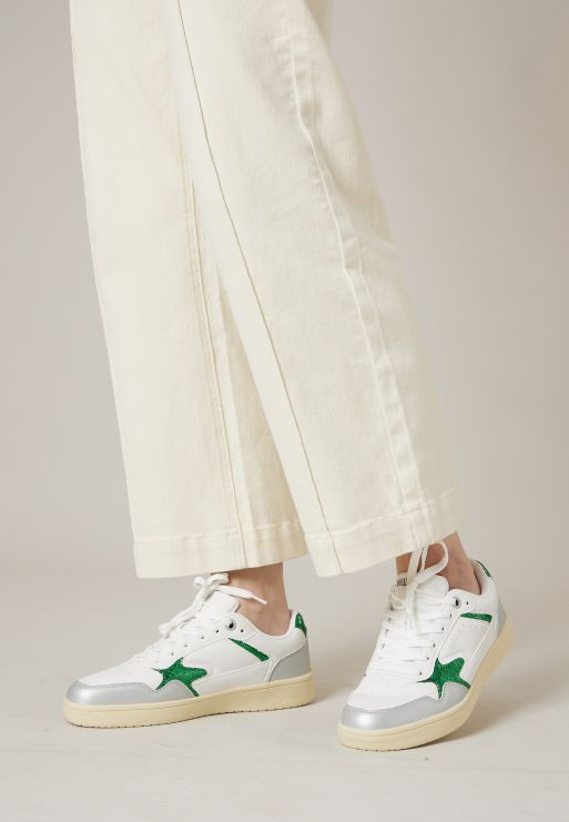 White and green model: Subtly combines silver details and green cutouts in glitter-effect fabric, adding a bright and trendy touch to your outfits.