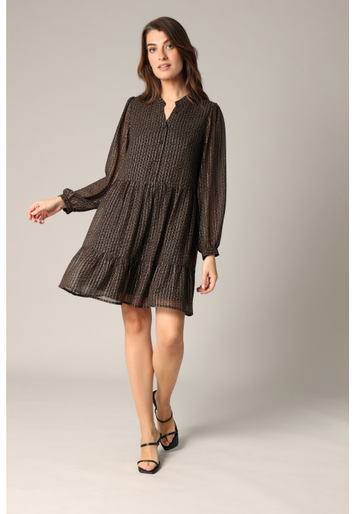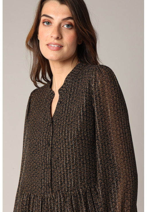 The JOYANE dress seduces with its fluid and feminine cut, enhanced by a delicate Tunisian collar and long, slightly puffed sleeves tightened at the wrists. The lightweight fabric, dotted with a refined graphic pattern, subtly plays on transparency. Its ruffled hem adds an airy and dynamic touch to the ensemble. Ideal for a look that is both chic and casual, this dress is suitable for special occasions as well as days when you want to feel effortlessly beautiful.