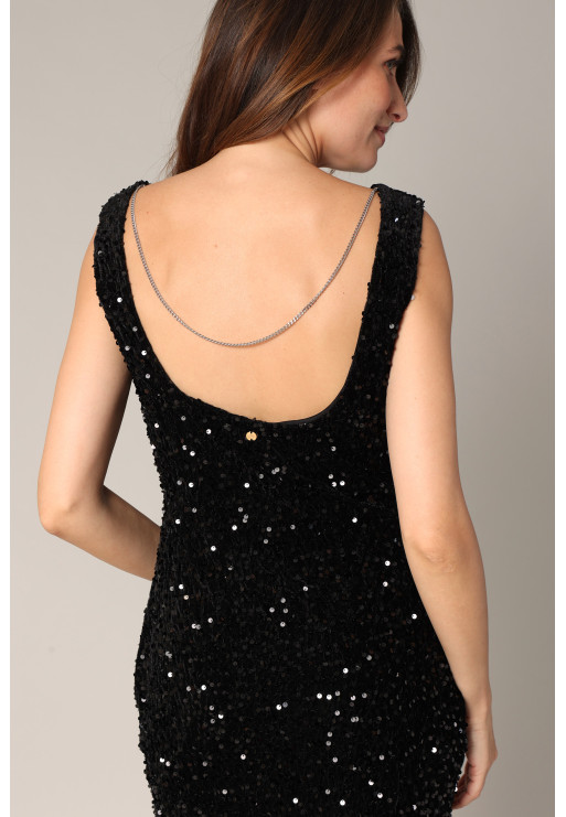 Shine bright in this sleeveless, sequin-covered mini dress. Its fitted cut flatters your figure, while its beautifully scooped back adds a touch of refined sensuality, enhanced by a fine metallic chain that accentuates the nape of the neck. Designed for special occasions, this piece will enhance your look at your most festive evenings. A bold and elegant choice that won't go unnoticed.