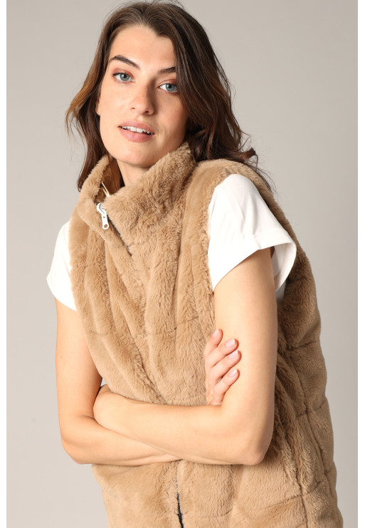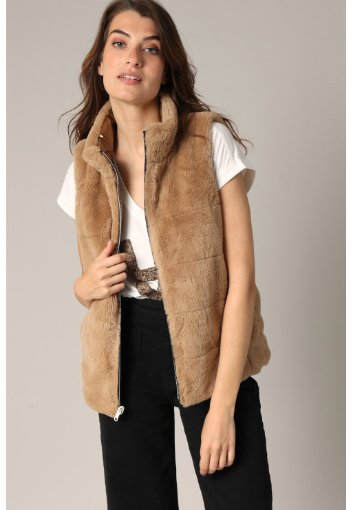 Reversible sleeveless zip-up puffer jacket with a stand-up collar and faux fur lining. This ultra-practical piece combines style and comfort with a bold metallic exterior and an ultra-soft faux fur interior. Its sleeveless cut allows for great freedom of movement, ideal for mid-season or winter layering. The stand-up collar protects from the cold while structuring the silhouette. Easy to wear on both sides as desired, the NARA puffer jacket is a must-have for a feminine look that's both cozy and urban.