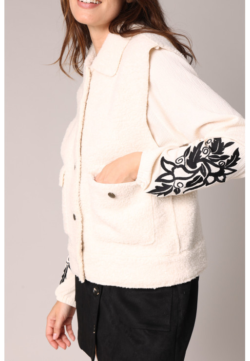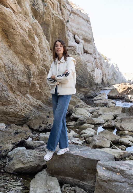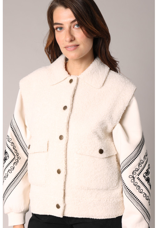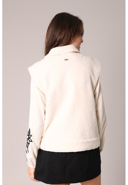 Sleeveless shearling jacket with flap pockets, snap button closure and structured shirt collar. This piece combines comfort, warmth and a trendy look, perfect for mid-season or for creating stylish layers. Its soft feel and straight cut make it an easy-to-match essential, while the patch pockets add a practical and modern touch. Wear it over a sweater or shirt for a cozy urban look.