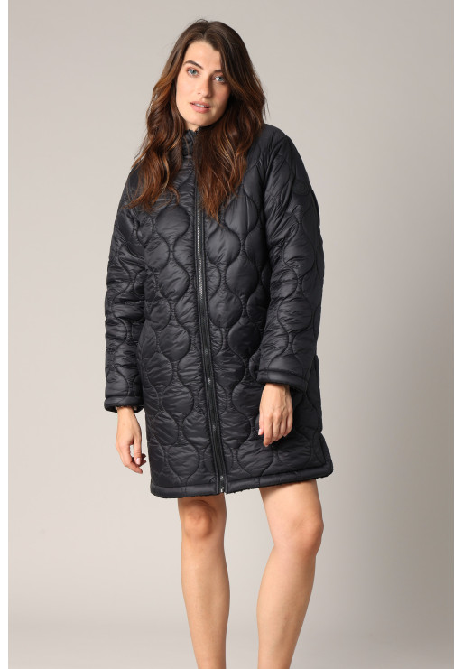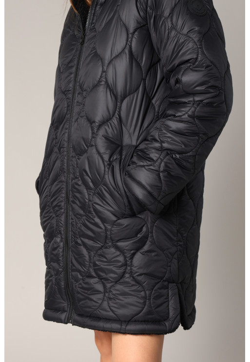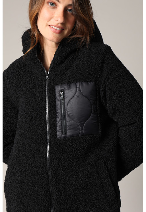 This reversible coat boldly plays on contrasts: one side in soft and fluffy sherpa for cozy days, and the other in shiny quilted fabric for a more urban and structured look. Its oversized cut ensures a comfortable fit, while the wraparound hood protects you from the elements. A clever detail: a zipped chest pocket for a style that's both functional and modern. Perfect for changing your style depending on your mood or the weather.