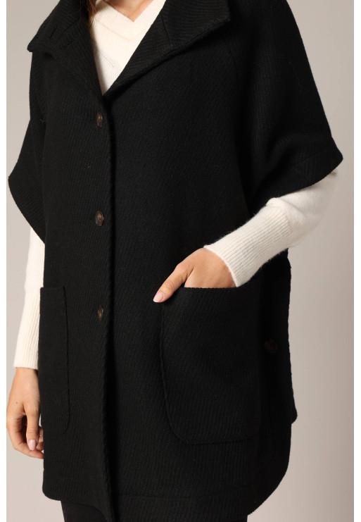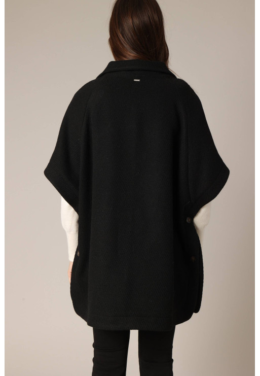 An enveloping piece that flirts between muted elegance and a relaxed look. This oversized cape stands out with its subtly ribbed texture and wide, dropped sleeves, perfect for layering over a knit sweater. The high collar gives it a sophisticated touch, while the two large patch pockets reinforce its practicality. The highlight? Its composition contains wool, for natural warmth and a noble drape. An ideal piece for cool days when you want to combine comfort and style with ease.