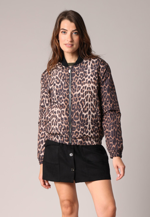 Leopard print bomber jacket with ribbed finishes and front zip.