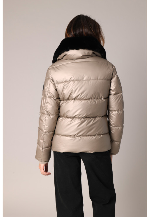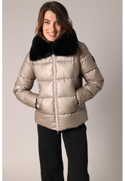 This women's puffer jacket offers a chic and modern look thanks to its large, ultra-soft collar. It is quilted for warmth and comfort. The jacket features a cropped fit, tapered cuffs, and two practical zippered front pockets. Round patch with the DEELUXE brand signature on the sleeve.