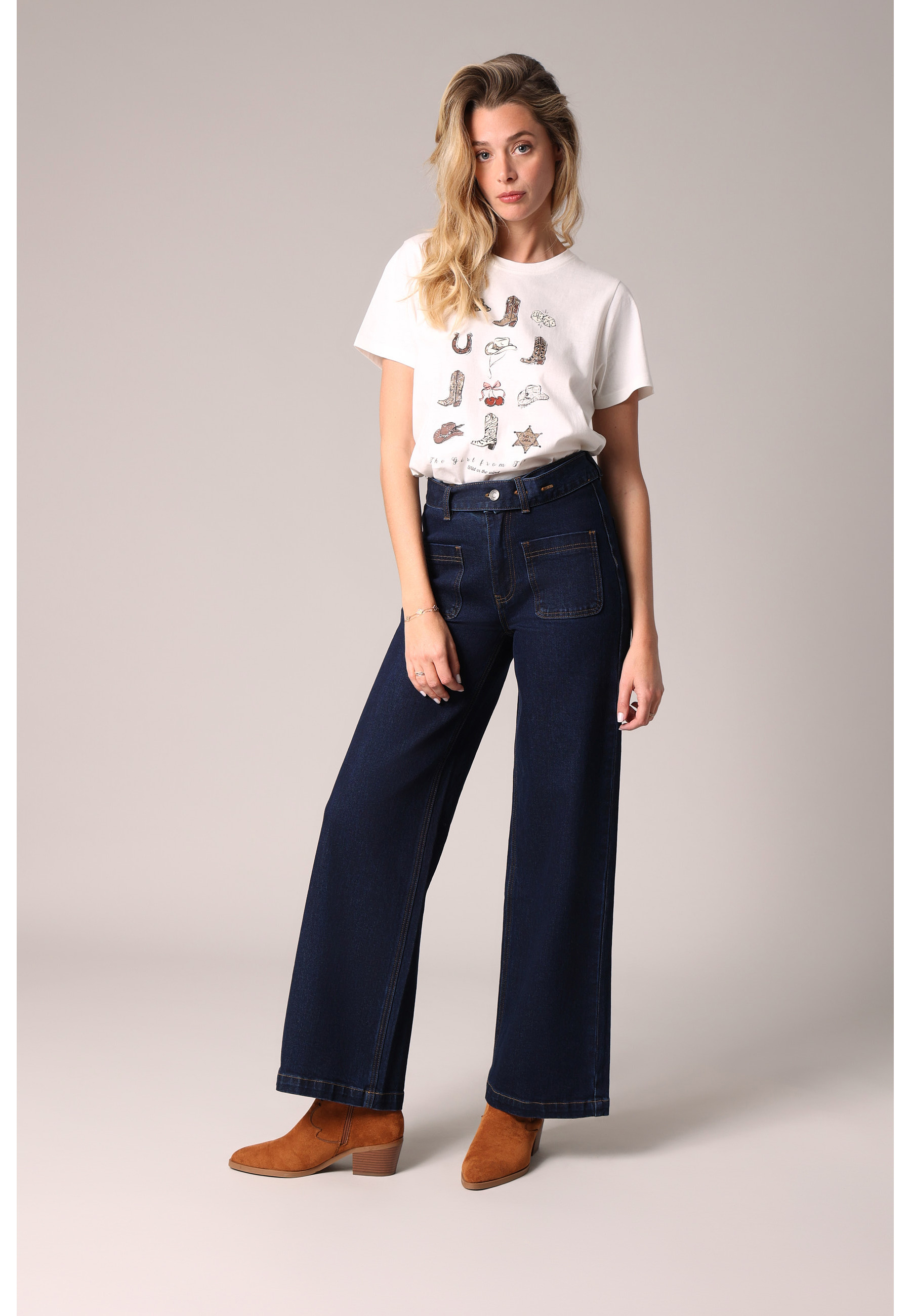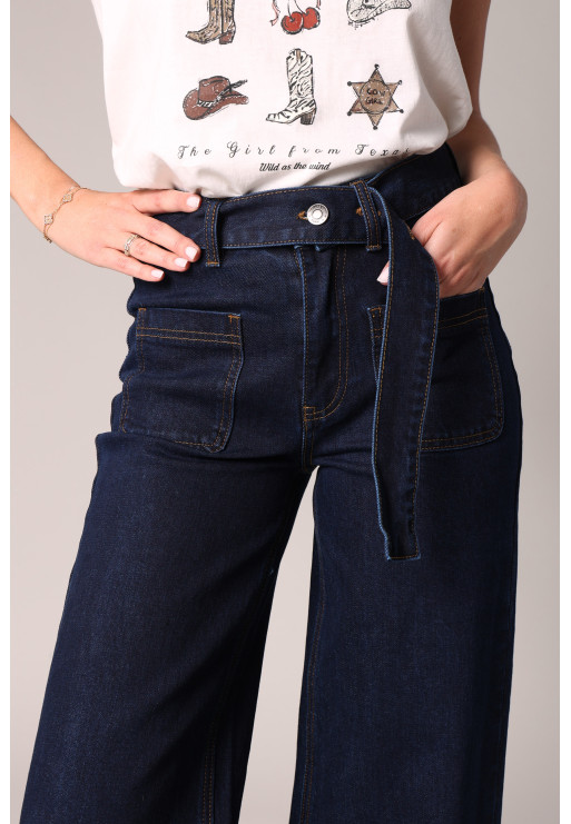 The KAMI jeans revisit the vintage look with a wide, flattering fit, ideal for shaping the silhouette. Their high waist elongates the legs and beautifully defines the waist thanks to a tonal tie belt. Crafted from stretch cotton denim, they offer comfort and support all day long. The front patch pockets reinforce their retro utilitarian style, perfect for adding a touch of originality to your outfits. Pair with a tucked-in tee or a flowing blouse for a balanced and stylish look.