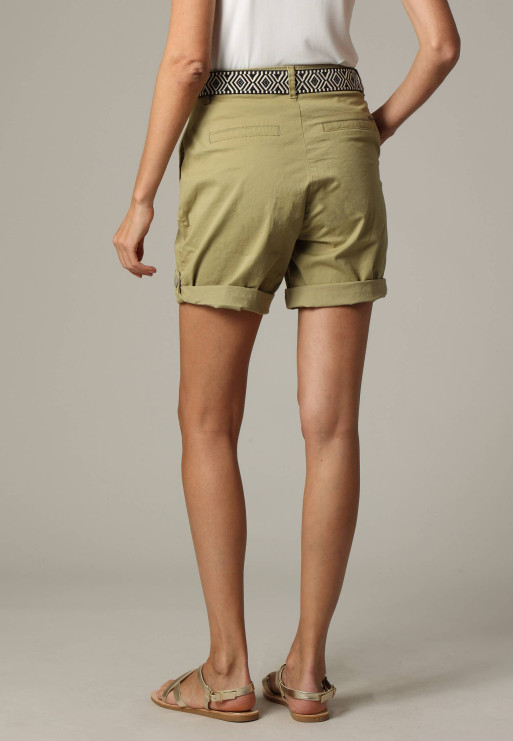Mid-length shorts with ethnic patterned belt and cuffed bottom