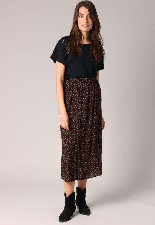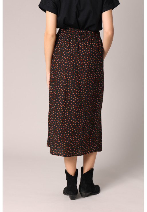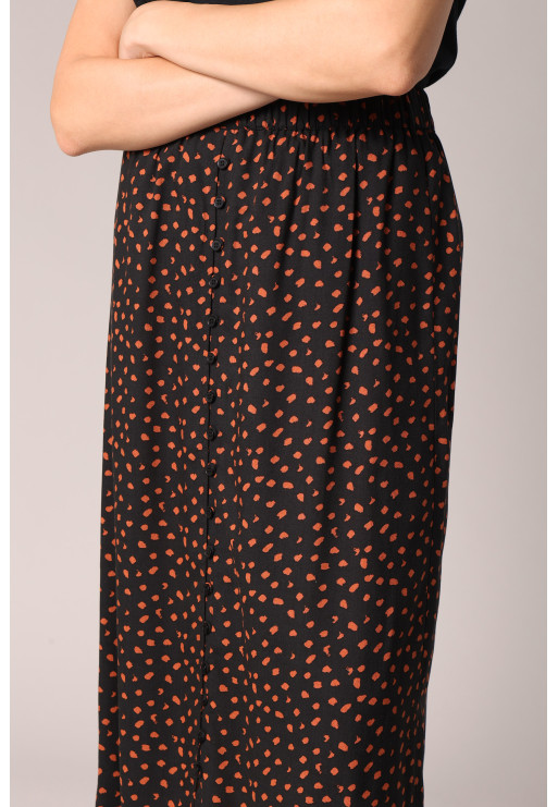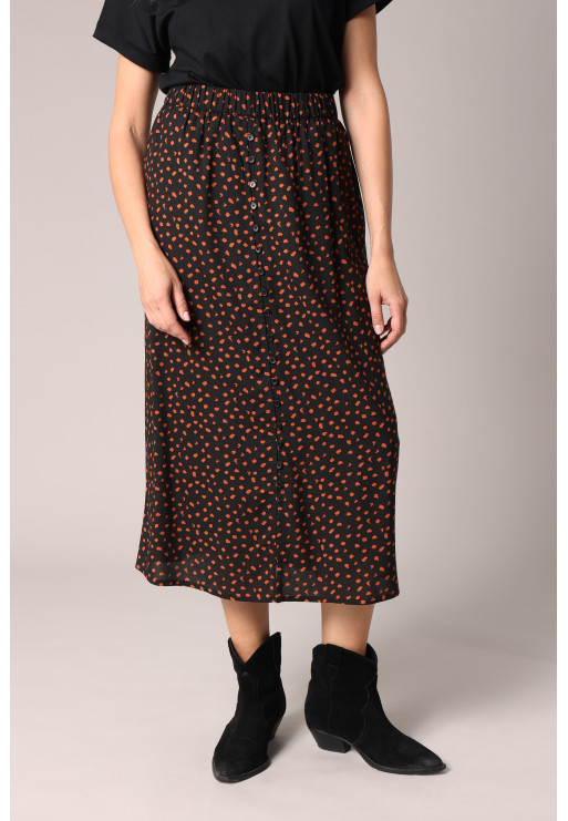 This long printed skirt has a fluid, feminine silhouette, enhanced by an elasticated waistband that guarantees absolute comfort every day. Its spotted print in warm tones adds a discreet yet bold graphic touch, while the full buttoning on the front elegantly structures the piece. Easy to match, it can be worn with a tucked-in t-shirt or an oversized sweater depending on the season. A revisited basic that offers a relaxed look full of character.