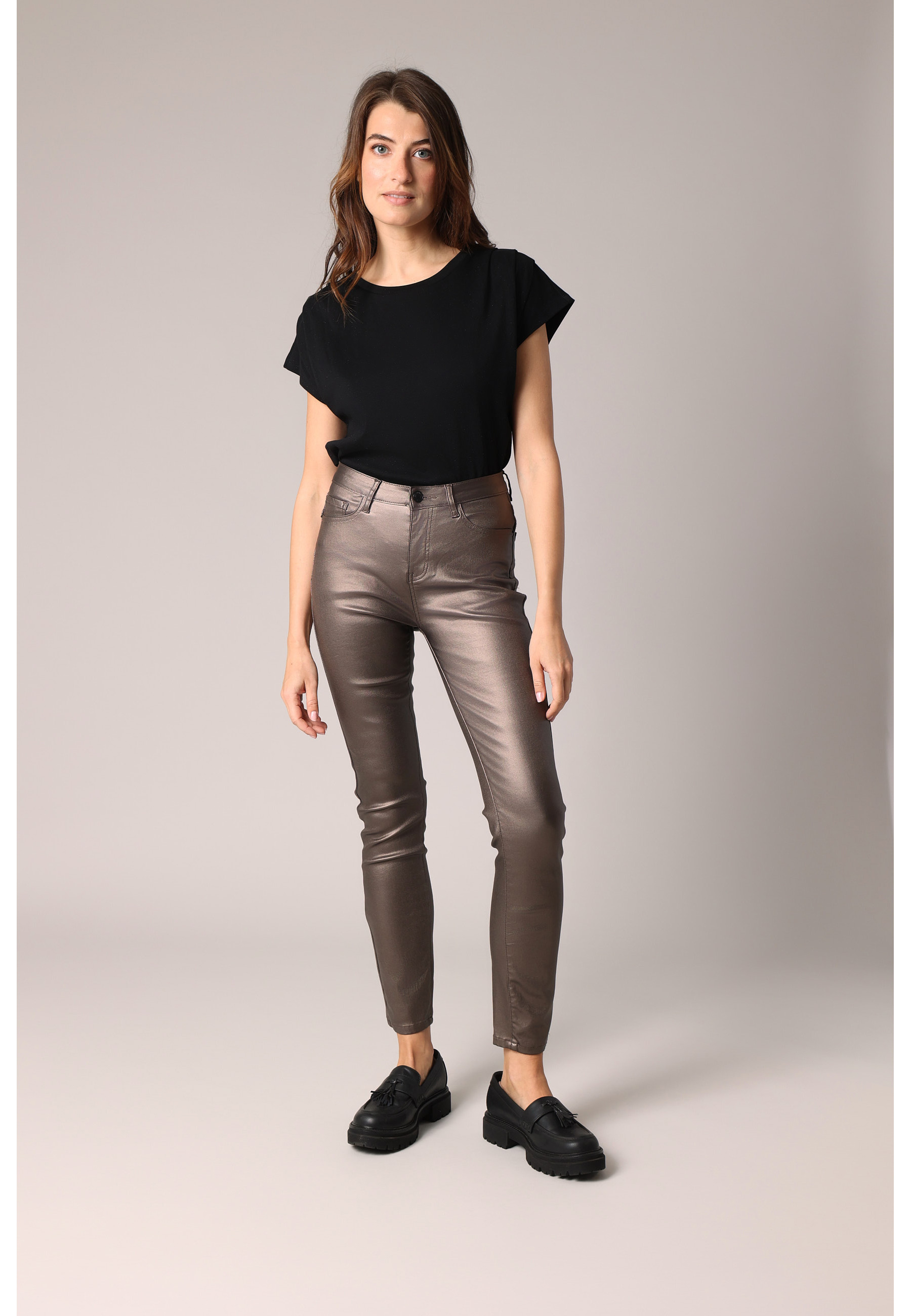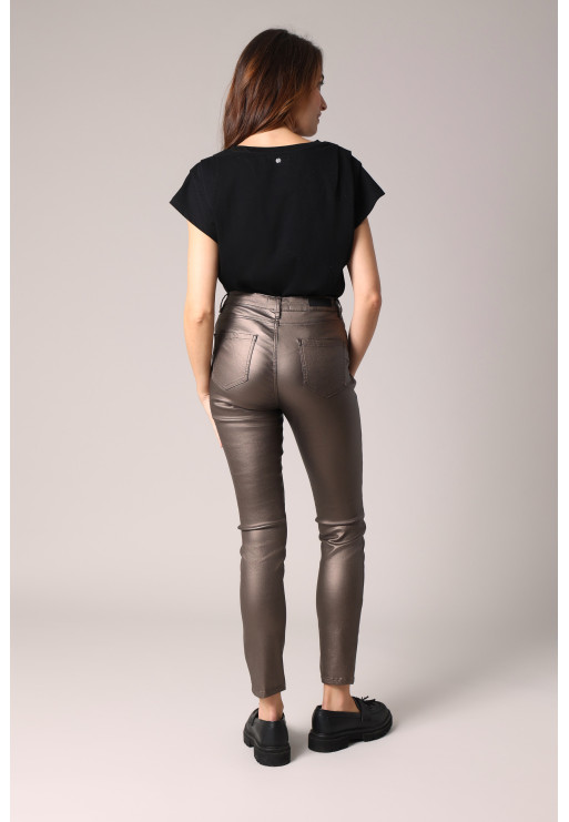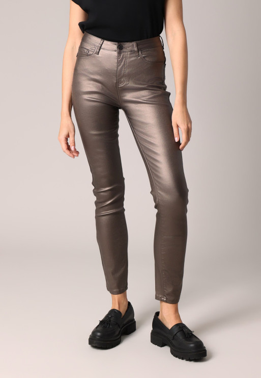 These high-waisted slim-fit pants stand out with their shiny metallic finish, perfect for brightening up your day and night looks. Their close-fitting cut elegantly hugs the figure while maintaining great freedom of movement. Featuring five pockets and a zipped closure with button, they combine urban style with a confident glam touch.