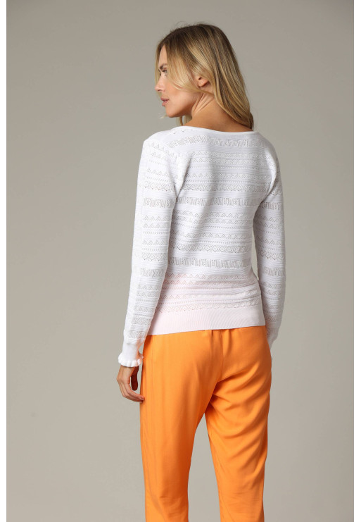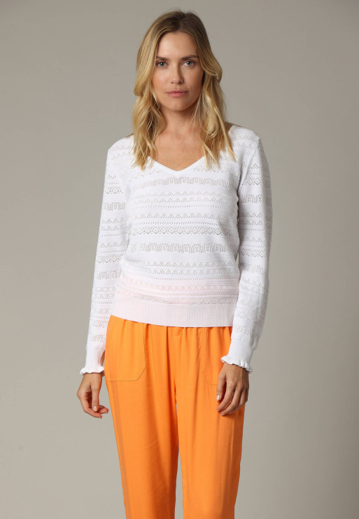 Openwork knit sweater with V-neck and wavy detail on the sleeves
