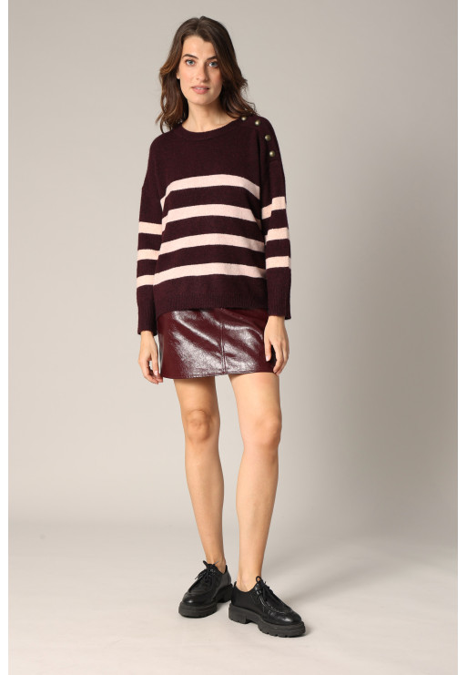 The FRANCINE sweater captivates with its contrasting stripes and buttoned shoulder, adding a touch of character. Its slightly loose, straight cut ensures comfort and modernity. Ideal for effortlessly structuring an outfit, this style pairs easily with raw-cut jeans, dress pants, or a midi skirt. An everyday essential revisited with a distinctive detail for a contemporary, assertive style.