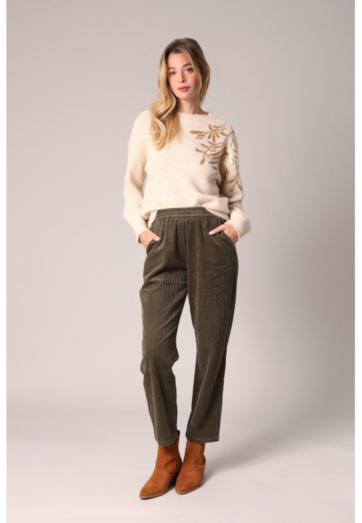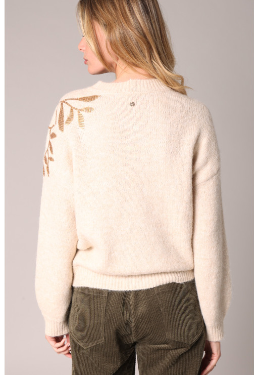 This sweater stands out with its leaf-shaped sequin embroidery, positioned on the shoulder and upper sleeve for a chic and luminous effect. Its soft and slightly fluffy knit is made from recycled material, for an elegance that is as responsible as it is refined. The ribbed finishes at the collar, cuffs, and hem reinforce its structured look, while its straight cut adapts to all body shapes. A model designed to brighten up your winter outfits, from raw denim to elegant trousers.