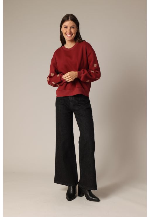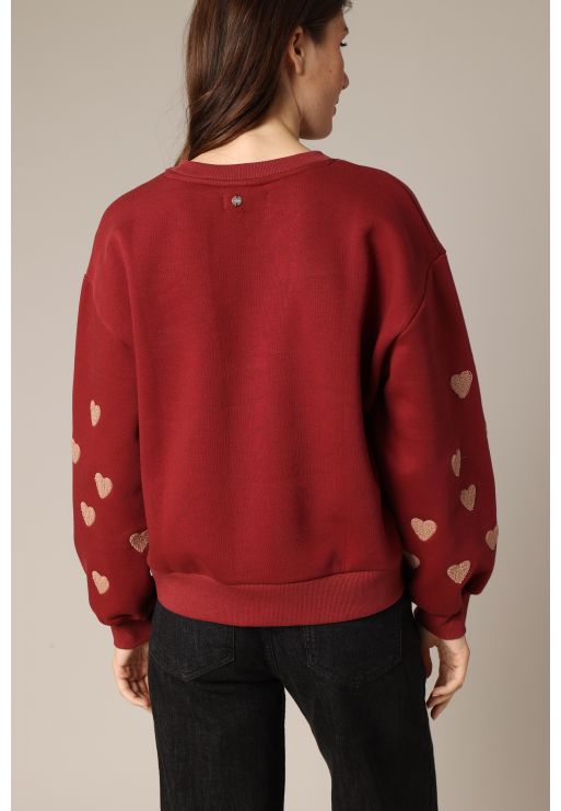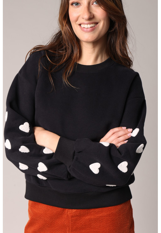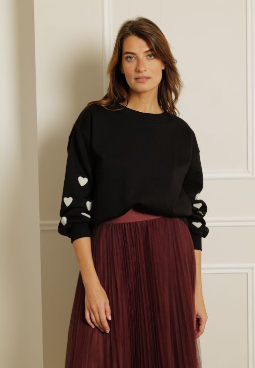 This long-sleeved sweatshirt is all about attention to detail, with adorable little hearts in relief scattered across the sleeves, a statement of affection for your casual looks. Its straight cut and classic crew neck make it a comfortable basic, while its slightly puffed sleeves add a feminine touch. A perfect style to warm up your days in style—and why not grab a few compliments along the way?
