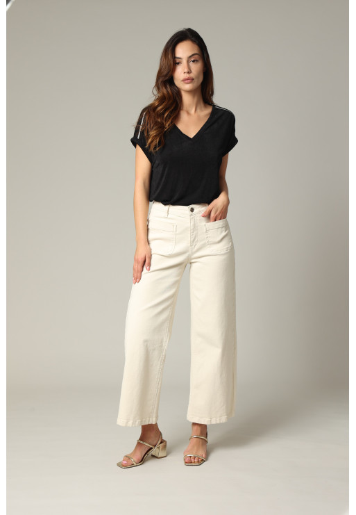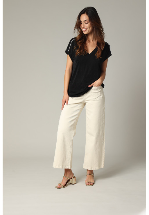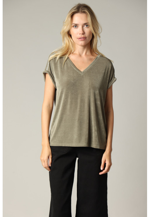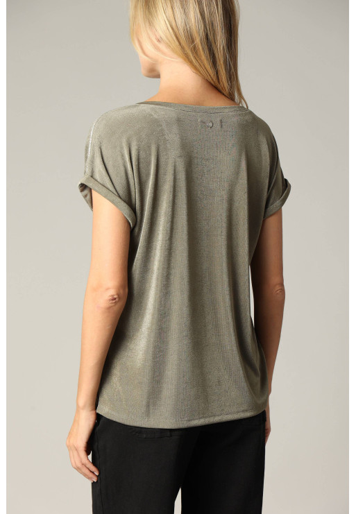 Loose V-neck T-shirt with silver piping on batwing sleeves