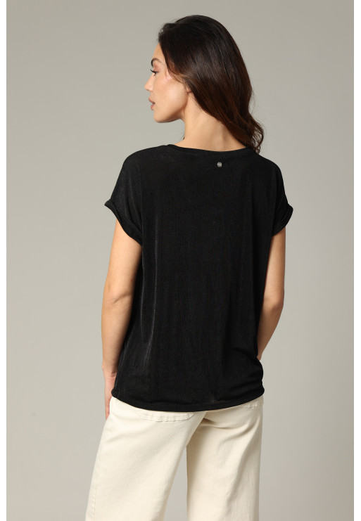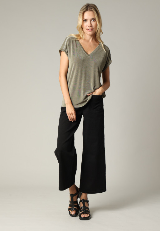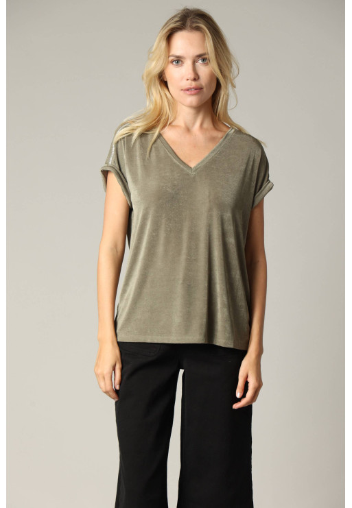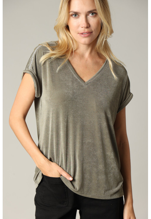 Adopt an elegant look in any circumstance with the DJALI loose V-neck T-shirt for women. With a fabric that subtly captures the light and a silver piping on its batwing sleeves, it has a unique look!