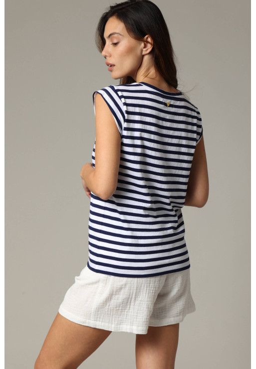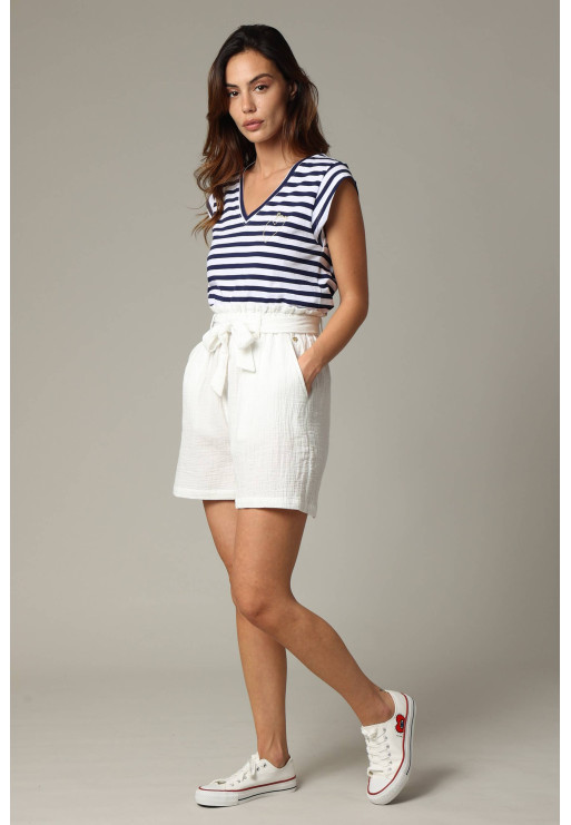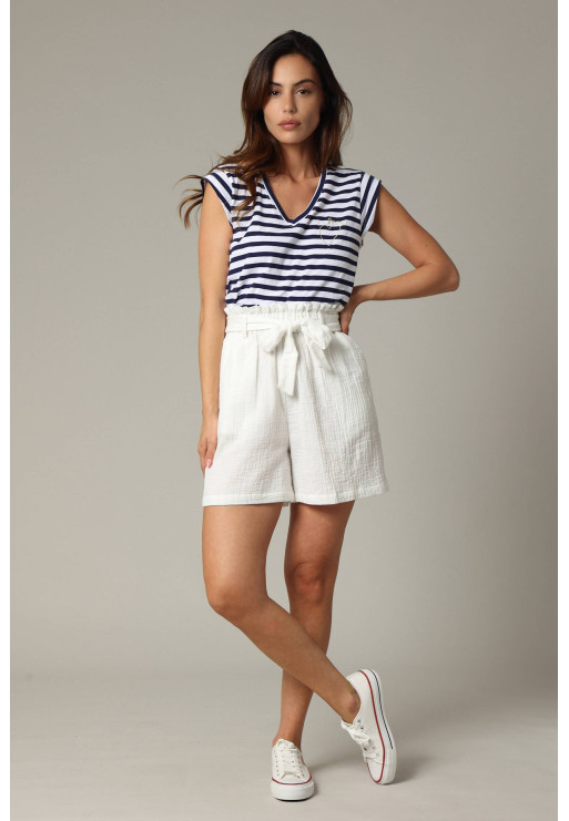 The VAMIKA T-shirt is made of very soft and high-quality cotton jersey. It is original with its loose fit that flatters the figure. For a casual look, it can be worn with wide jeans, a high-waisted skirt or shorts in summer. It is the classic sailor shirt, in a twisted version with a touch of audacity.