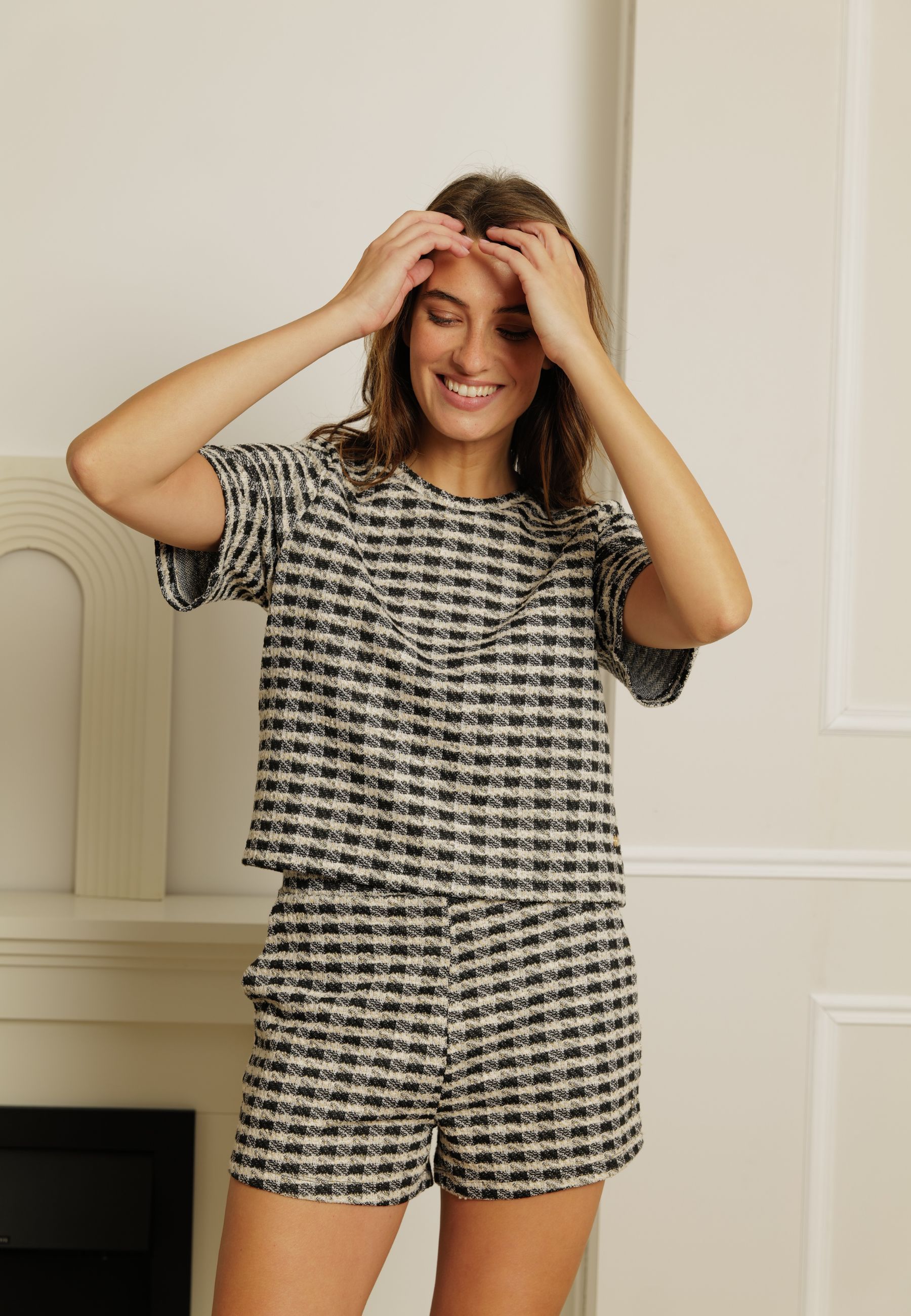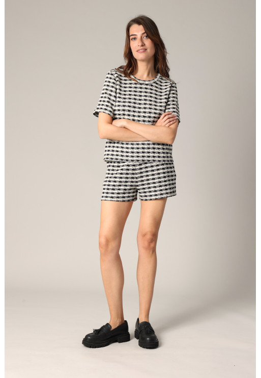 The LILY t-shirt stands out with its textured fabric with a tweed-effect pattern that instantly adds depth to the silhouette. Its straight cut and round neck give it a structured look, ideal for an effortlessly polished look. The short sleeves and buttoned teardrop finish at the upper back add a discreet touch of modernity. Comfortable and original, this top pairs easily with plain or matching bottoms to create a cohesive and stylish ensemble. Perfect for livening up an everyday outfit while maintaining a certain understated style.
