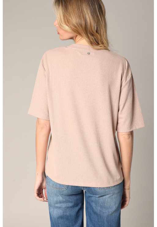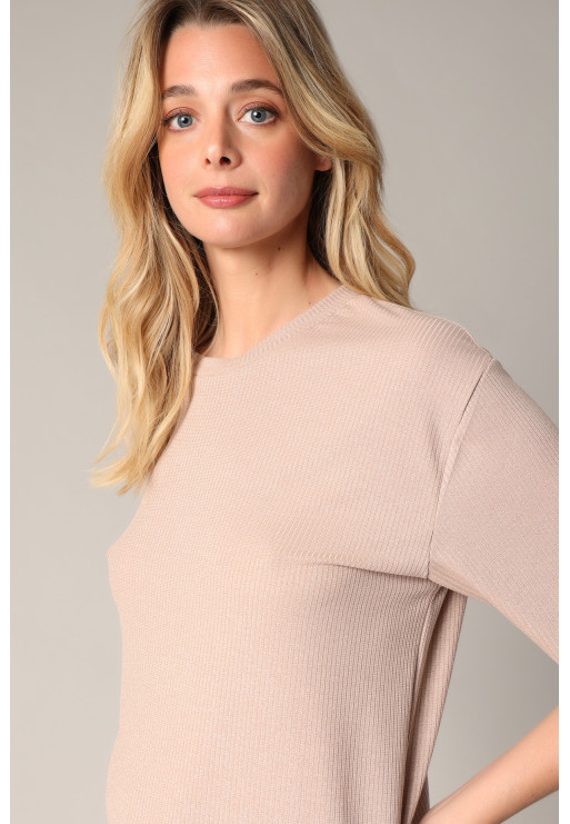 This ribbed knit T-shirt embodies modern simplicity with a touch of shine. Crafted from a soft, stretchy fabric, it feels great against the skin while ensuring a beautiful fit. Its straight cut and short sleeves make it a revisited basic, easy to wear alone or under a jacket. The fabric's slightly iridescent effect adds a subtle touch of light, perfect for enhancing your outfits with discretion and refinement throughout the day.