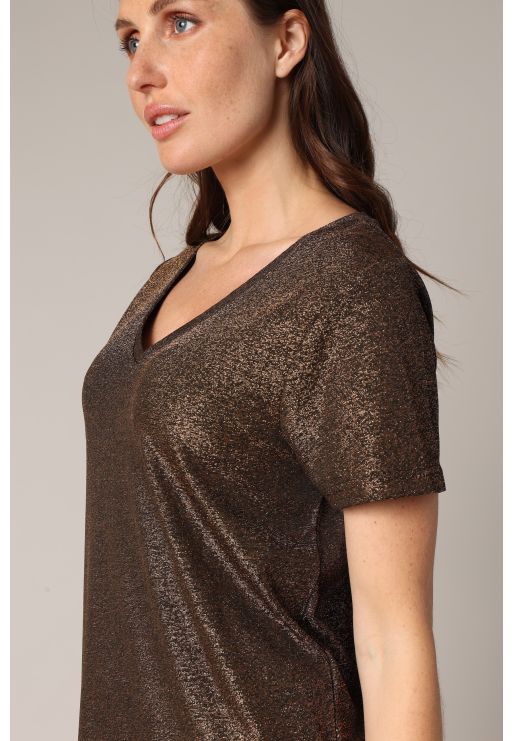 This flowing t-shirt features a shimmering, subtly textured knit. Featuring a flattering V-neck and classic short sleeves, it elegantly combines comfort and sparkle. Its soft, lurex-effect fabric adds a touch of light without being overly flashy, perfect for brightening up an outfit with ease. Designed to fit all body types, this style embodies a feminine, relaxed look.