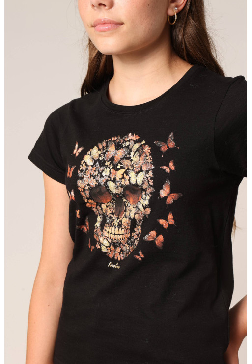 T-shirt fille à col V, BESKULL mixe esprit rebelle et poésie avec un grand imprimé tête de mort en fleurs et papillons.