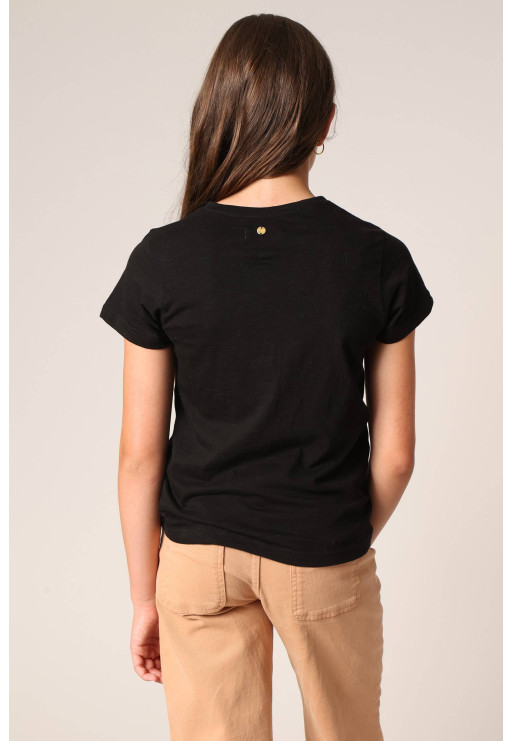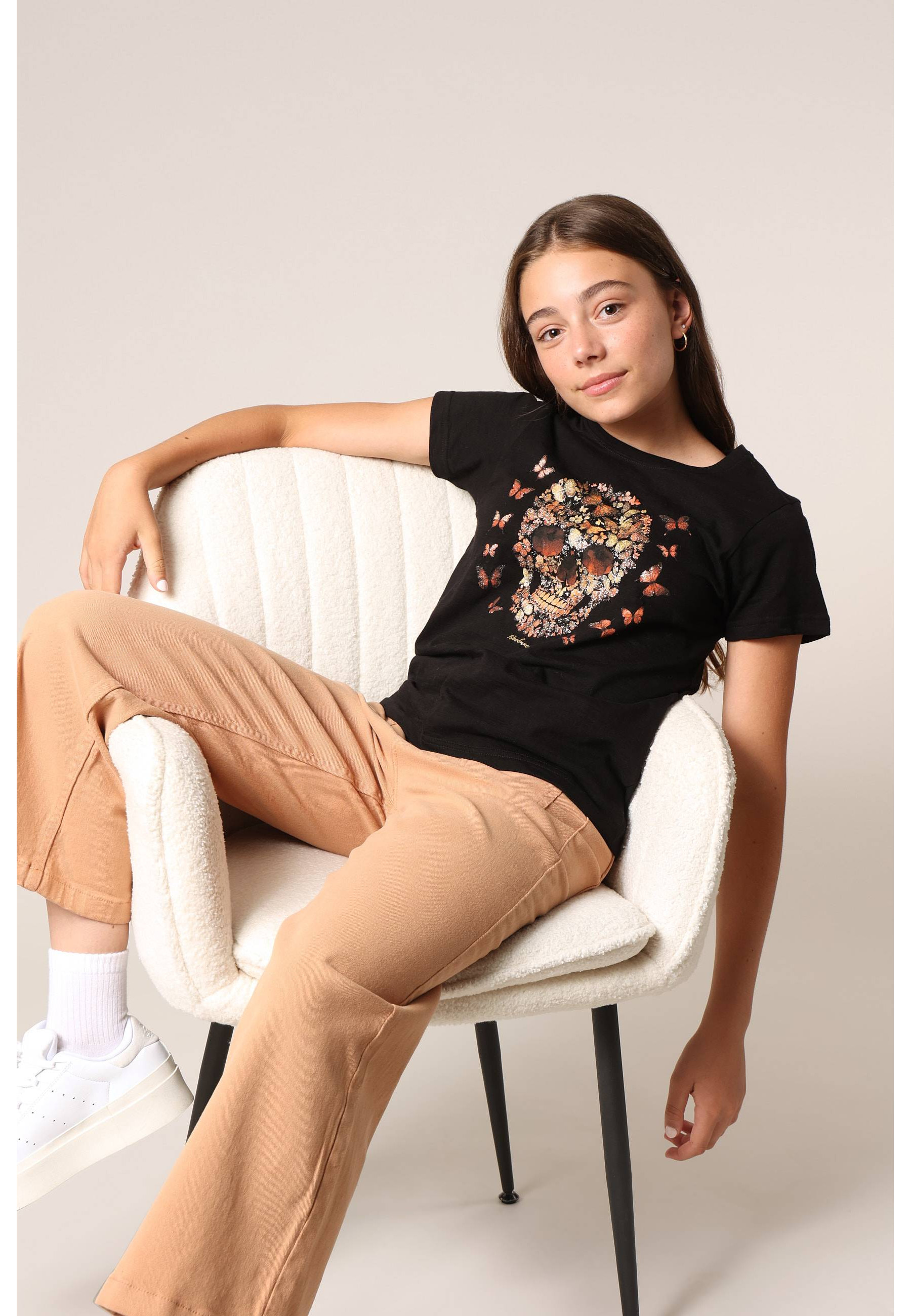 T-shirt fille à col V, BESKULL mixe esprit rebelle et poésie avec un grand imprimé tête de mort en fleurs et papillons.