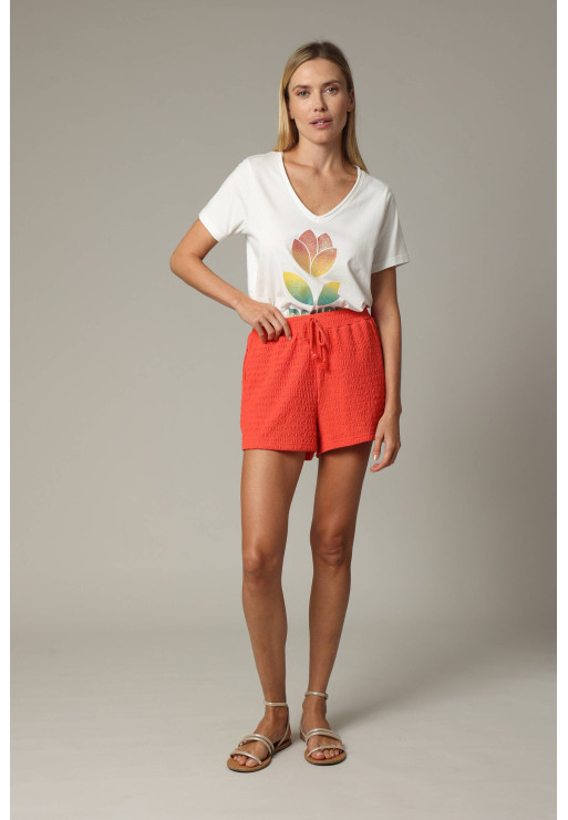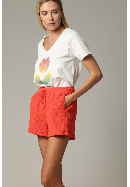 Craquez pour le short KAISSY, la pièce estivale incontournable pour des looks stylés. Son tissu gaufré léger et sa couleur corail vitaminée en font un choix parfait pour la saison d'été.