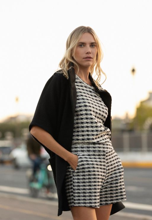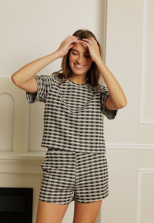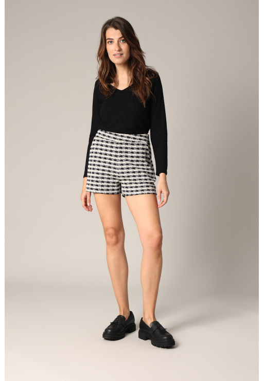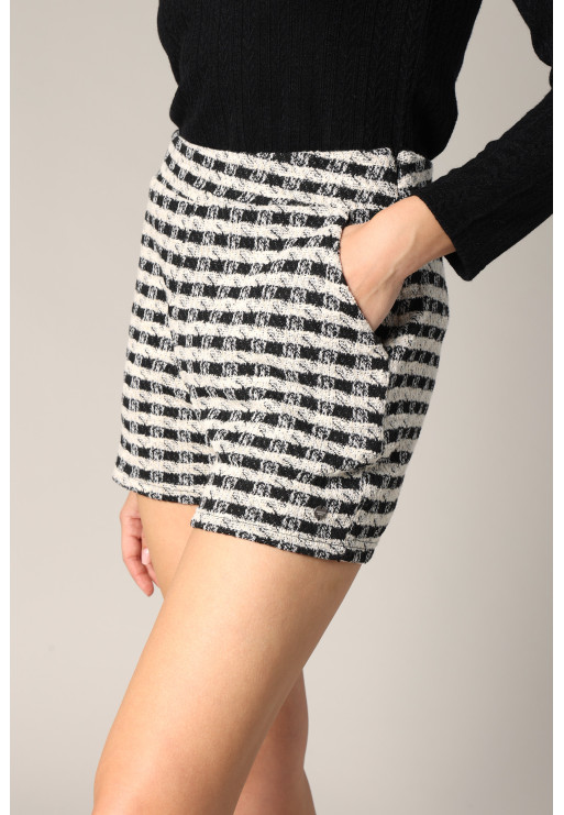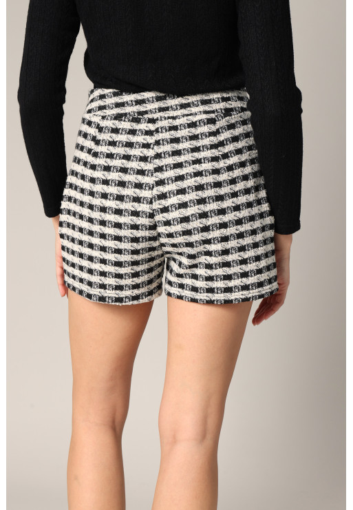 Ce short revisite l'élégance rétro au motif carreaux graphique noir et blanc.