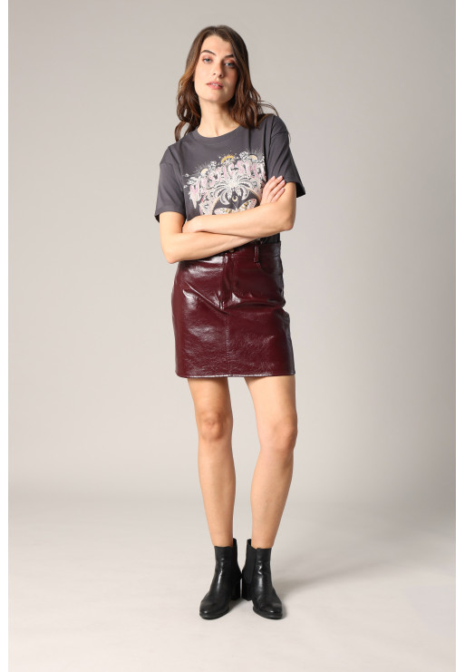 Mini-jupe pour femme DAMIA au style rock et tendance. Cette pièce en simili cuir brillant présente une coupe droite courte qui épouse la silhouette. Elle est dotée de deux poches plaquées à l’arrière, de passants de ceinture et d'une fermeture par bouton et zip à l'avant. Sa finition texturée lui donne un look audacieux, idéal pour dynamiser une tenue casual ou de soirée.