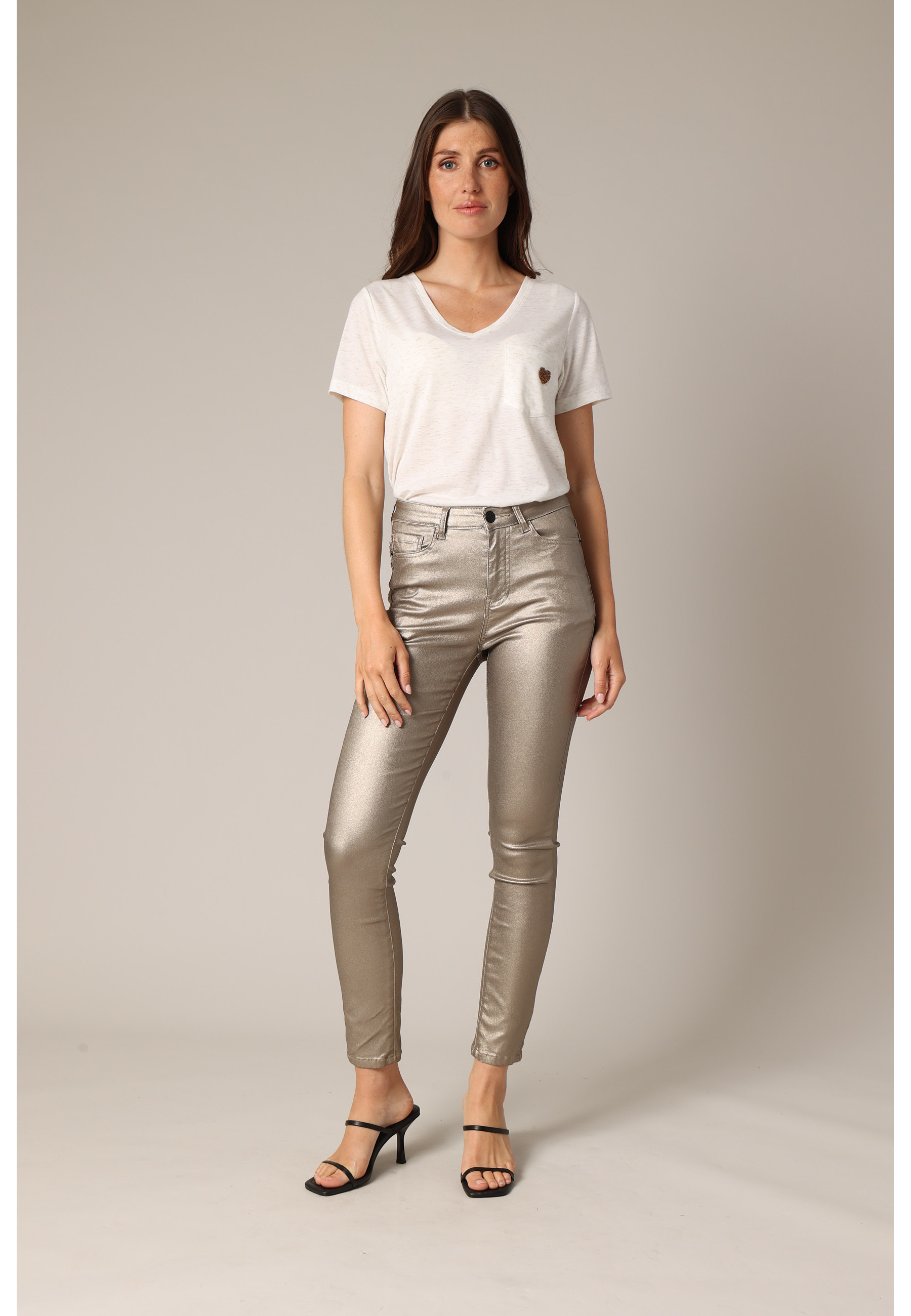 Ce pantalon slim taille haute se distingue par son fini métallisé brillant, parfait pour illuminer vos looks du jour comme de nuit. Sa coupe près du corps épouse élégamment la silhouette tout en conservant une belle liberté de mouvement. Doté de cinq poches et d'une fermeture zippée avec bouton, il combine allure urbaine et touche glam assumée.