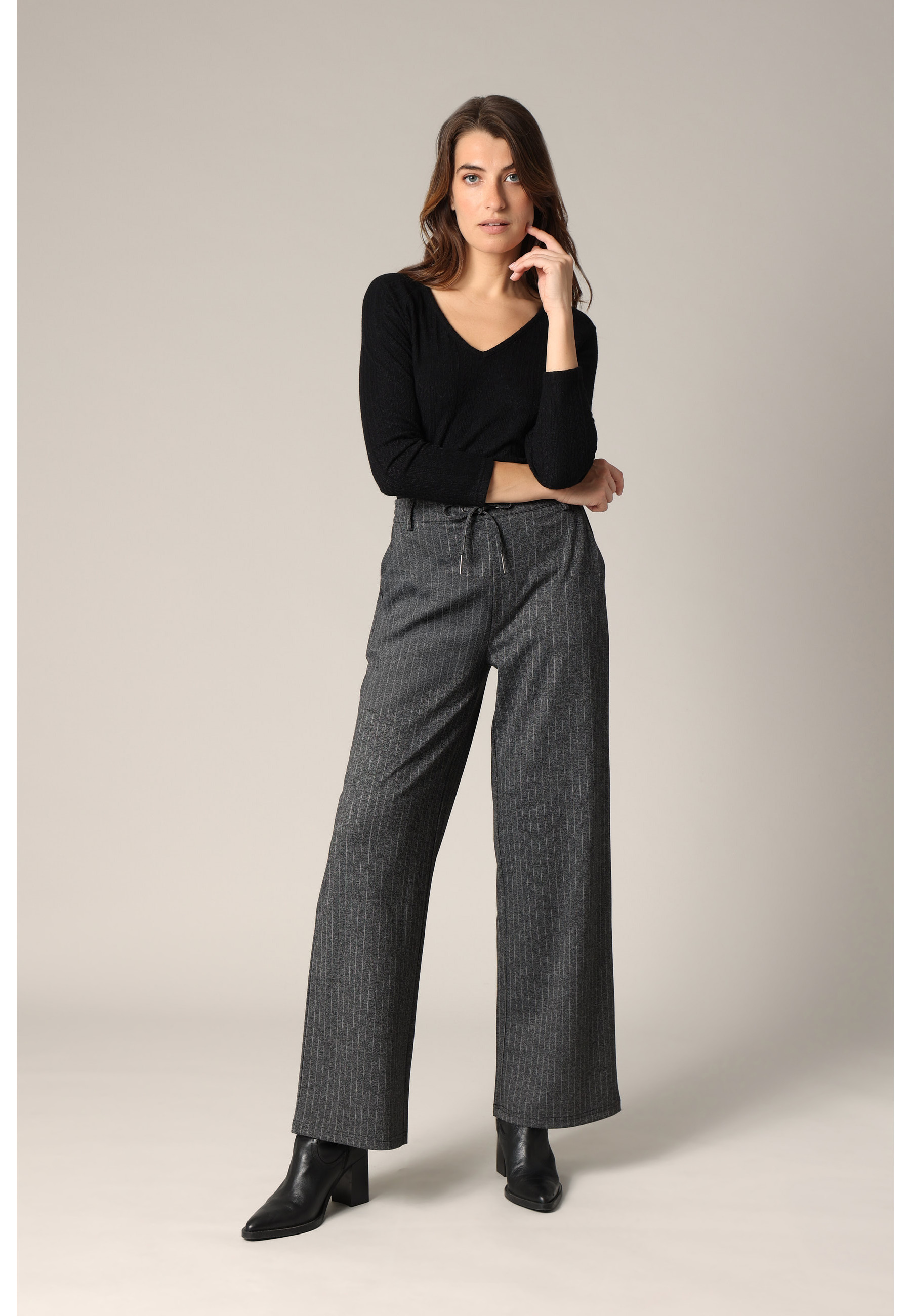 Ce pantalon large à pinces revisite le tailoring avec audace et souplesse. Sa coupe fluide et ample épouse le mouvement avec naturel, tandis que les fines rayures verticales allongent élégamment la silhouette.