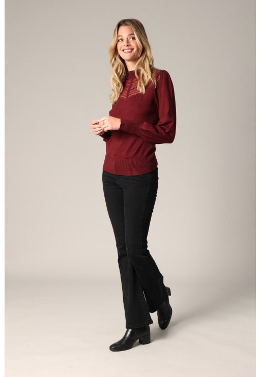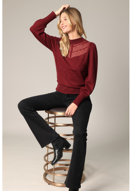 Ce pull dévoile un charme discret mais assumé, sublimé par un délicat jeu de transparence au niveau du col. L’empiècement en dentelle florale suggère sans trop montrer, offrant à ce modèle une aura romantique et sophistiquée. Ses manches légèrement bouffantes, resserrées aux poignets, apportent du volume et de l’élégance à l’ensemble, tandis que le col montant souligne le port de tête avec grâce. Ce pull s’impose comme une pièce précieuse, parfaite pour illuminer le quotidien comme les moments plus singuliers.