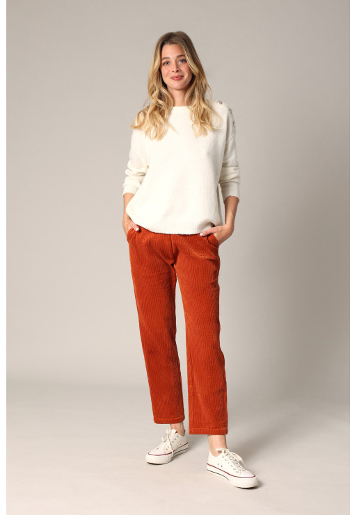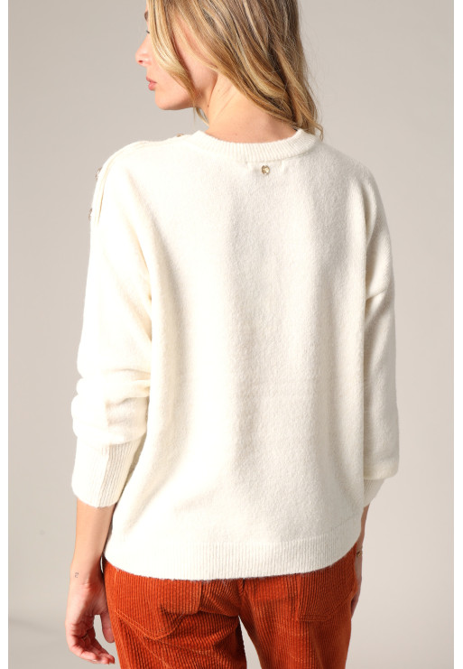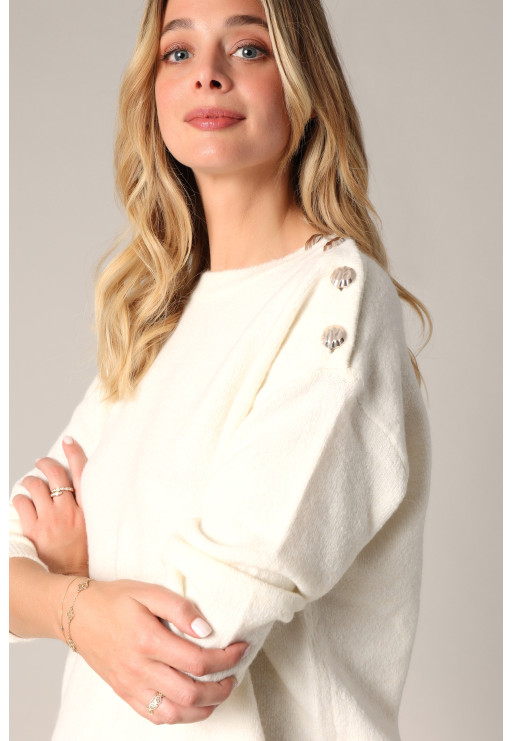 Confectionné dans une maille à base de matières nobles telles que la laine et l’alpaga, ce pull incarne l’équilibre parfait entre confort et raffinement. Son design intemporel est rehaussé par une épaule ornée de boutons décoratifs métallisés, apportant une touche d’originalité élégante. Les finitions en bord-côte au col, aux poignets et à la base structurent la silhouette avec finesse. Facile à associer à un jean ou une jupe, ce modèle offre un style à la fois chic et décontracté pour toutes les occasions de la saison.