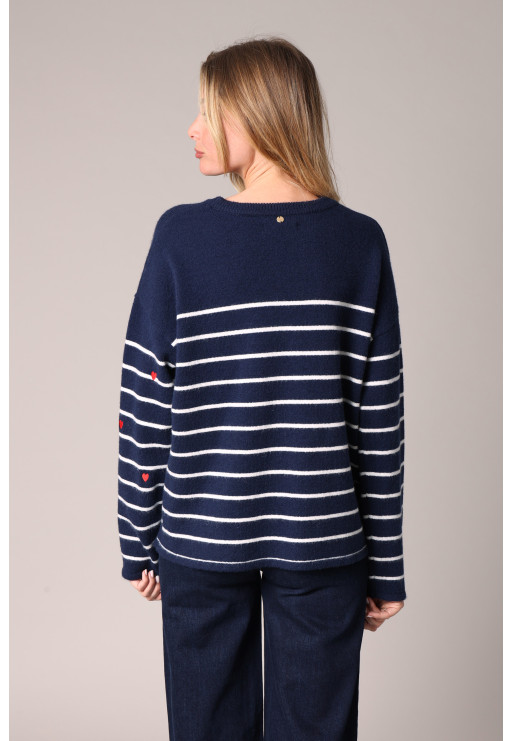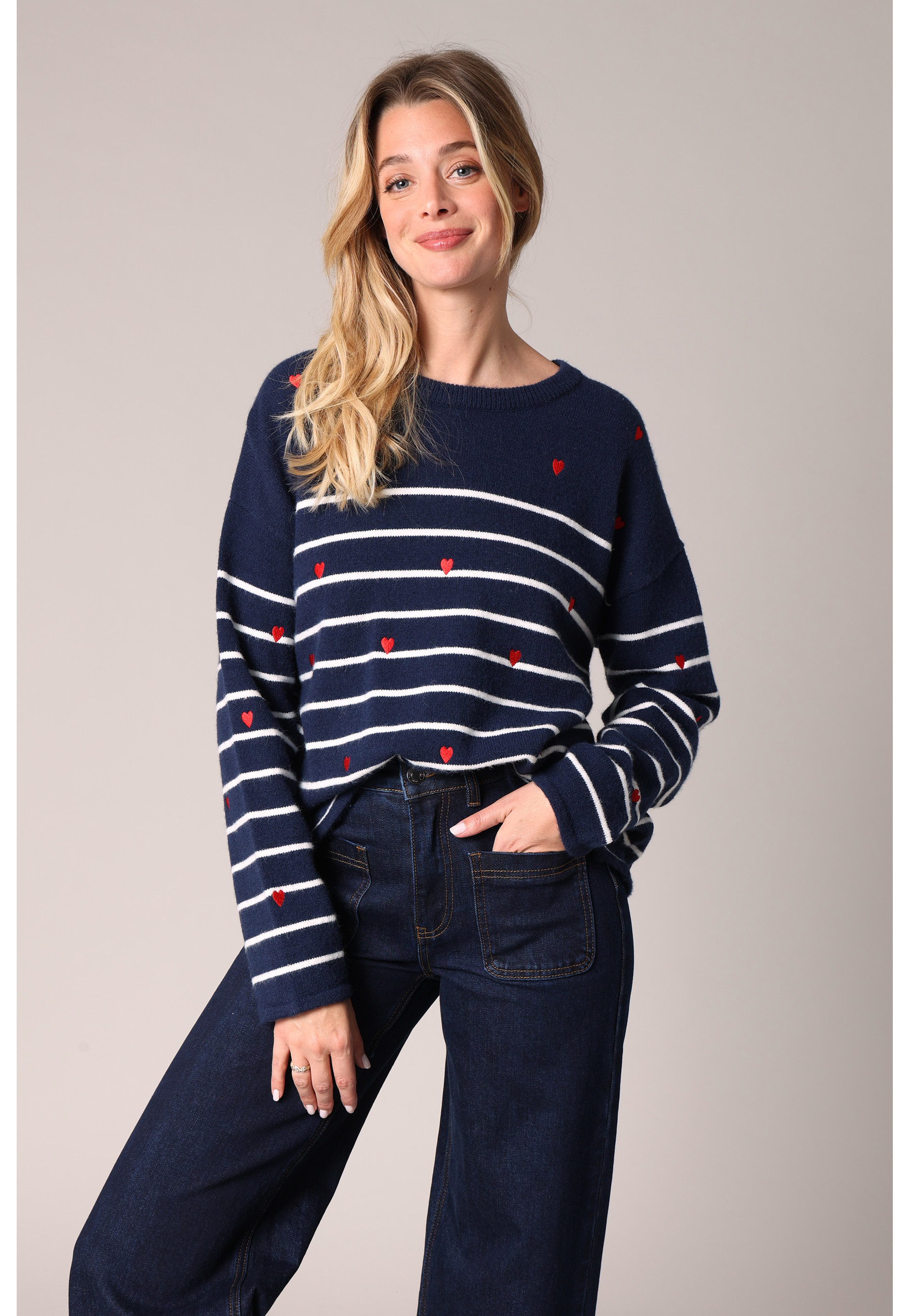 Le pull BERINDA est un vrai coup de cœur — littéralement ! Avec ses petites broderies en forme de cœur dispersées entre des rayures marine, il donne envie de tomber amoureux dès le premier regard. Sa coupe ample et sa maille douce en font un allié de choix pour les journées fraîches, tout en affichant une touche de fantaisie assumée. Son style marin revisité avec tendresse se porte aussi bien pour flâner le week-end que pour enchaîner les compliments au bureau. À porter avec un jean flare, une jupe trapèze ou même une bonne dose d’autodérision : ce pull ne se prend pas au sérieux… mais vous, vous allez l’adorer !