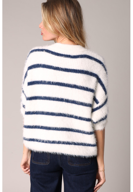 Le pull KYNDRA pour femme adopte une allure résolument décontractée avec ses larges rayures effet texturé, façon marinière revisitée. Sa coupe ample et ses manches courtes apportent une note moderne et relax, tandis que la maille duveteuse garantit un confort irrésistible. On l’imagine déjà réchauffer les cœurs lors d’un brunch improvisé ou en mode cocooning assumé. Avec son look faussement sage et sa douceur enveloppante, ce modèle joue la carte du style sans effort.